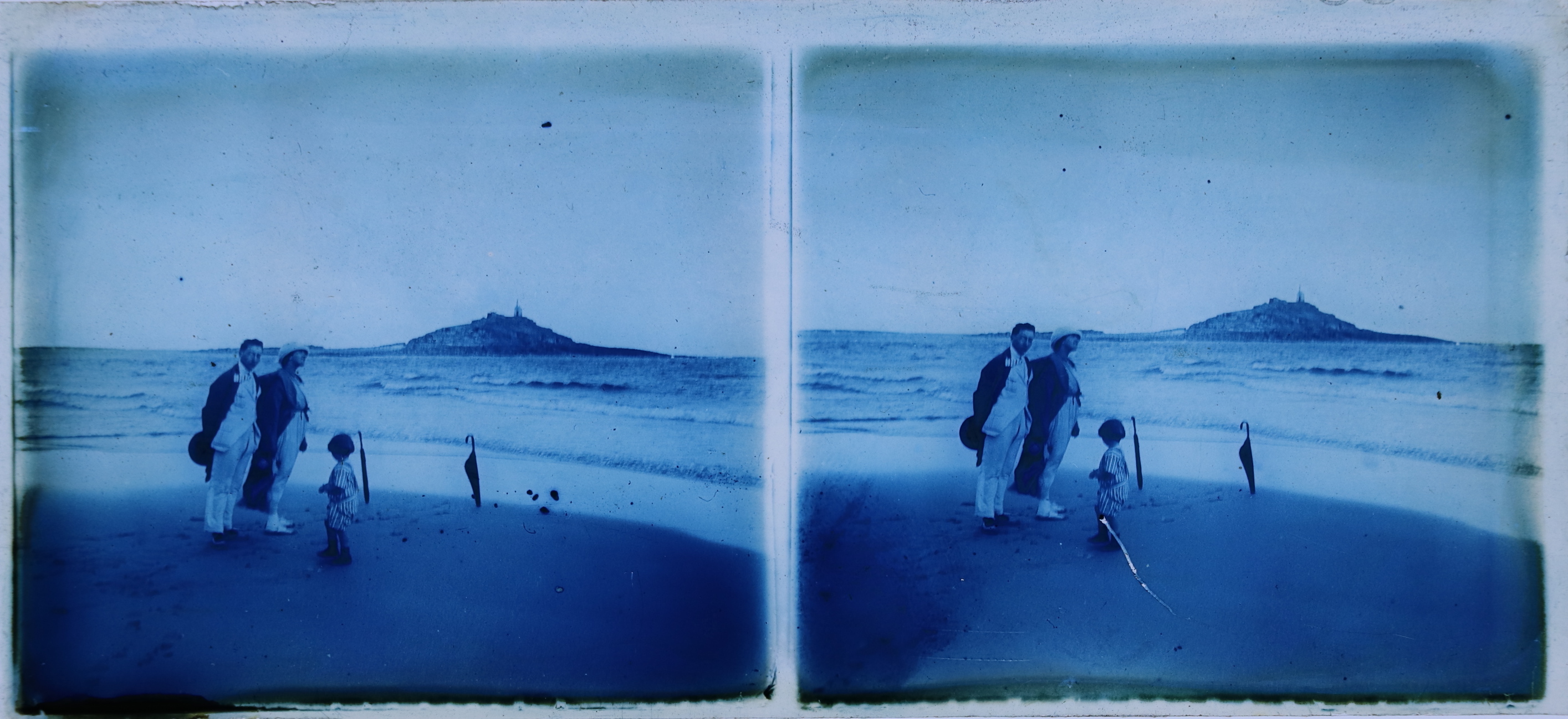 Une famille se promène sur le rivage de l'océan Atlantique, dans les années 1920.