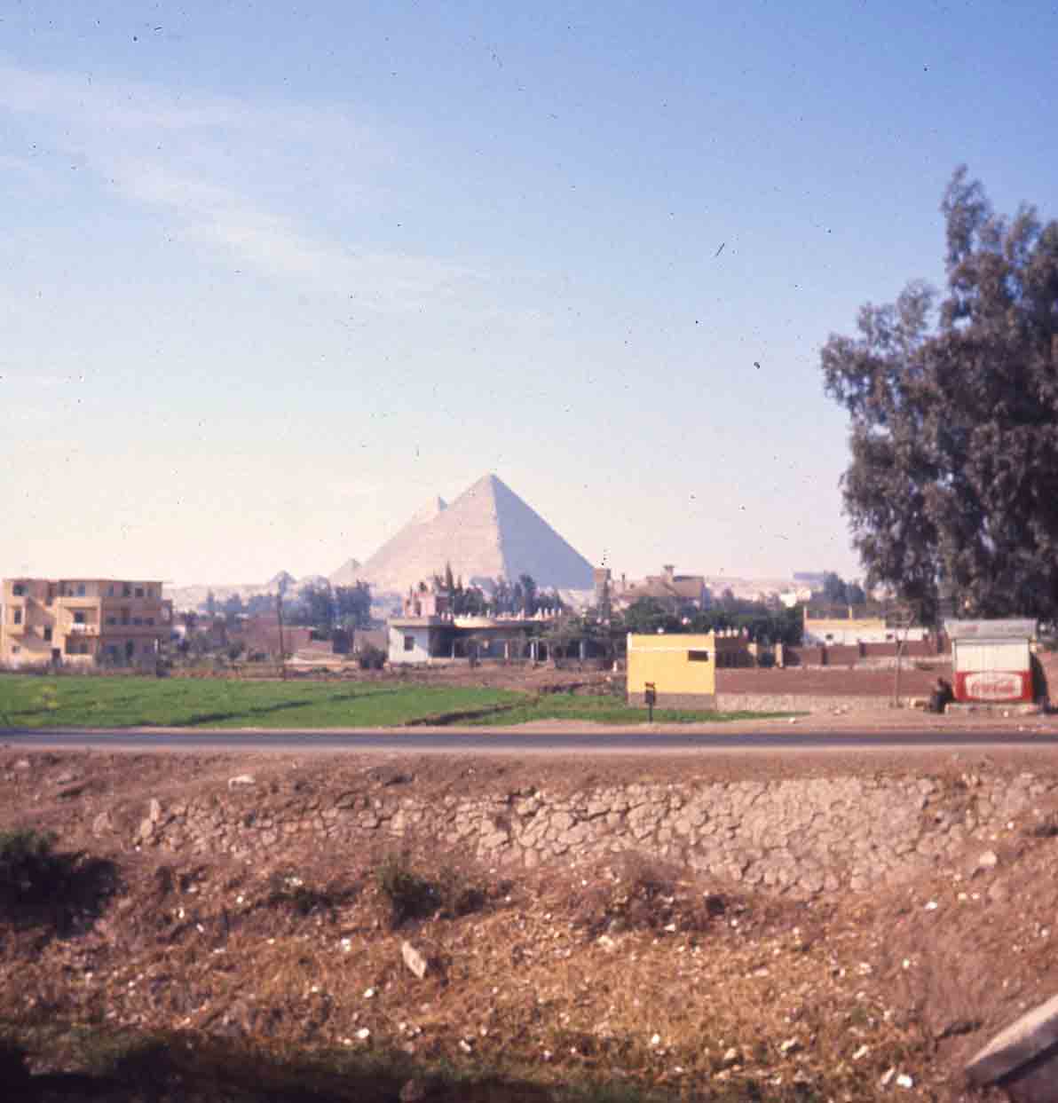 Photo lointaine des pyramides de Gizeh, au Caire. Il y'a une route en second plan, quelques bâtiments en troisième plan, et les pyramides en arrière plan.