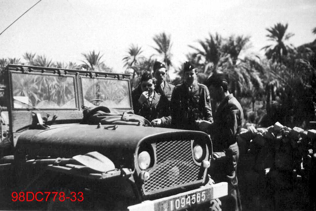 Quatre militaires autour d'une jeep. A l'arrière plan, on voit des palmiers.