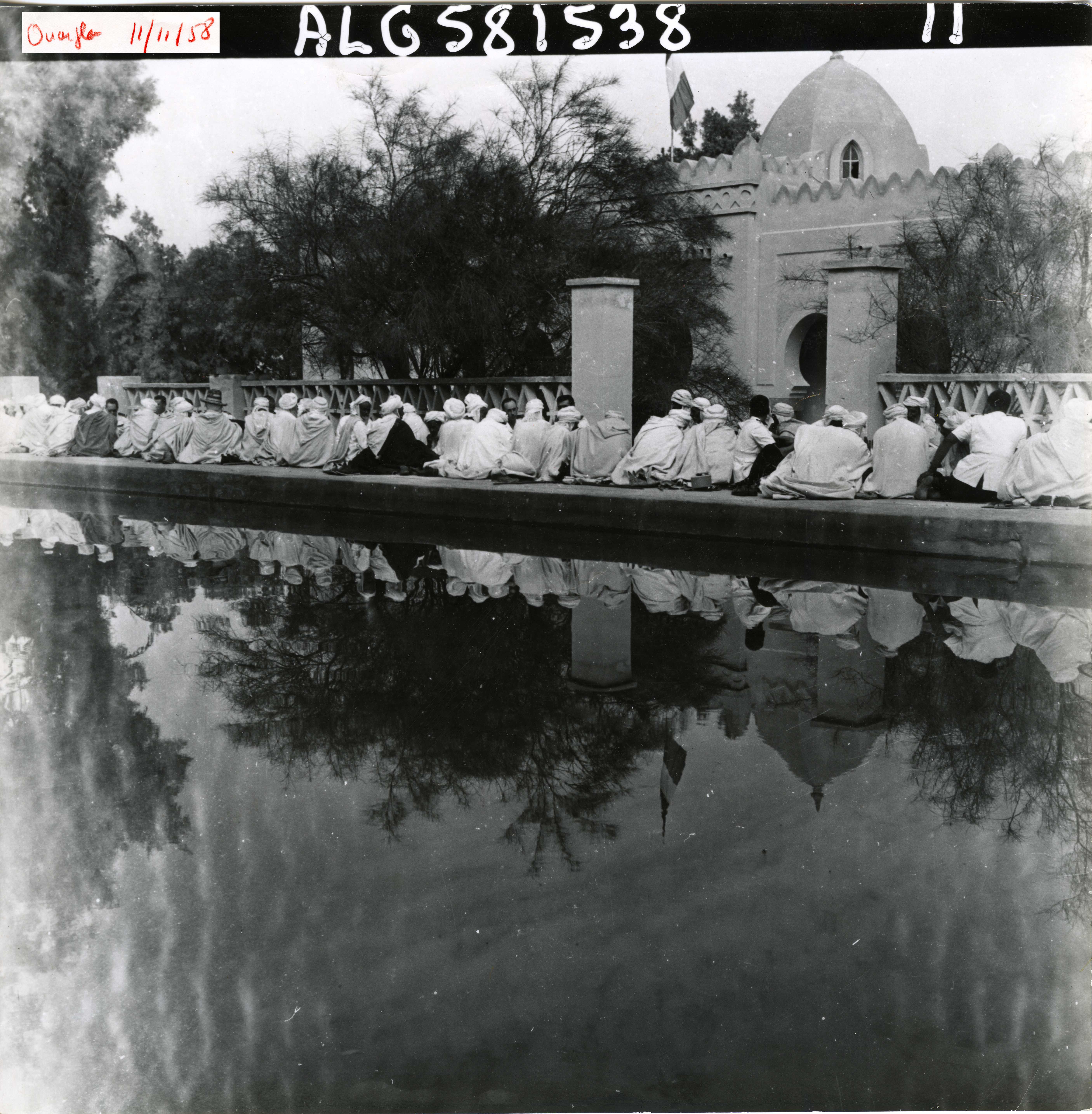Photo historique prise à Ouargla en 1958, représentant un rassemblement d’hommes en habits traditionnels près d’un bâtiment religieux ou administratif, au bord d’un bassin. Il s'agit peut-être d'une cérémonie.