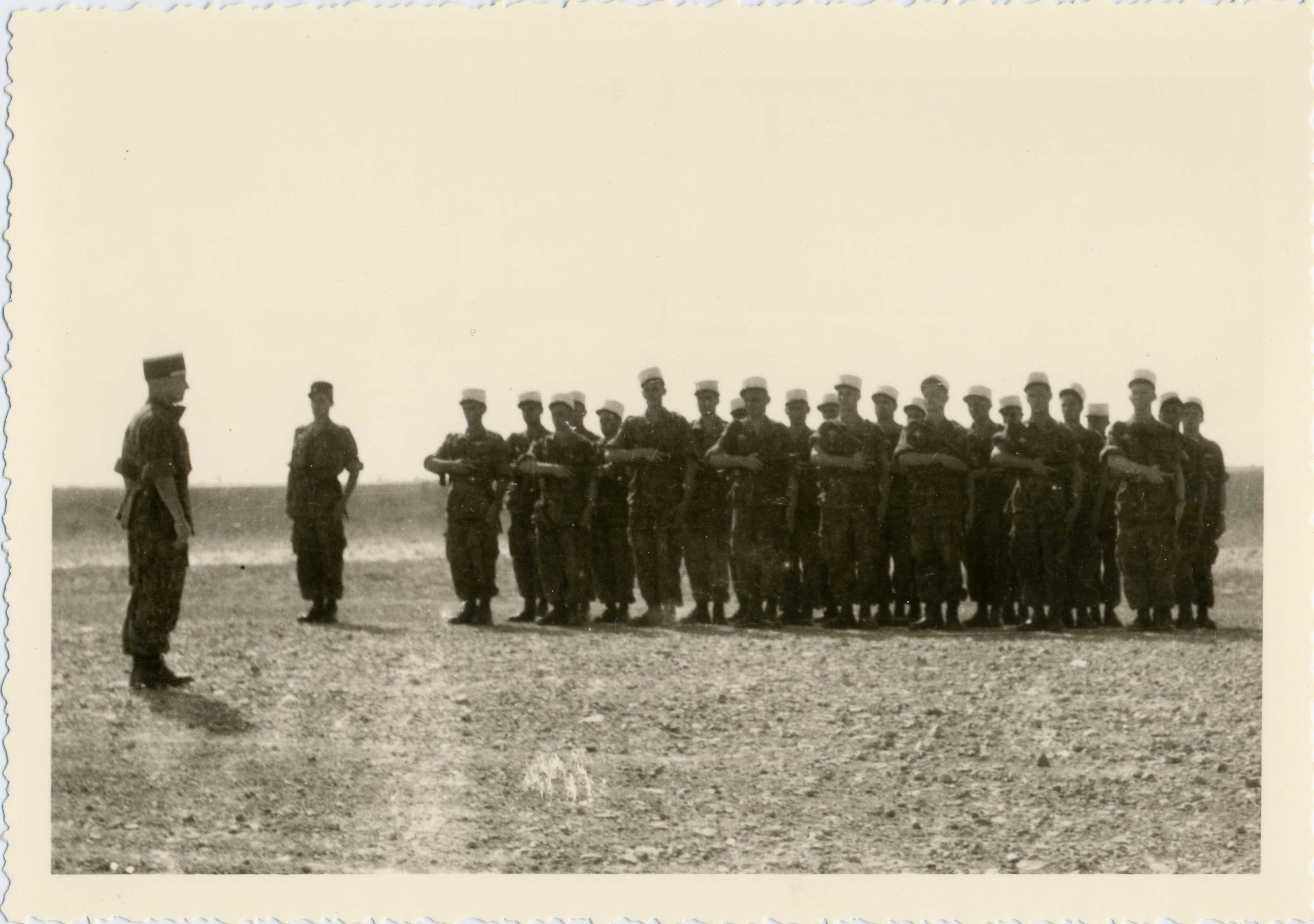 Rassemblement de militaires au garde à vous dans le désert pendant la Guerre d'Indochine