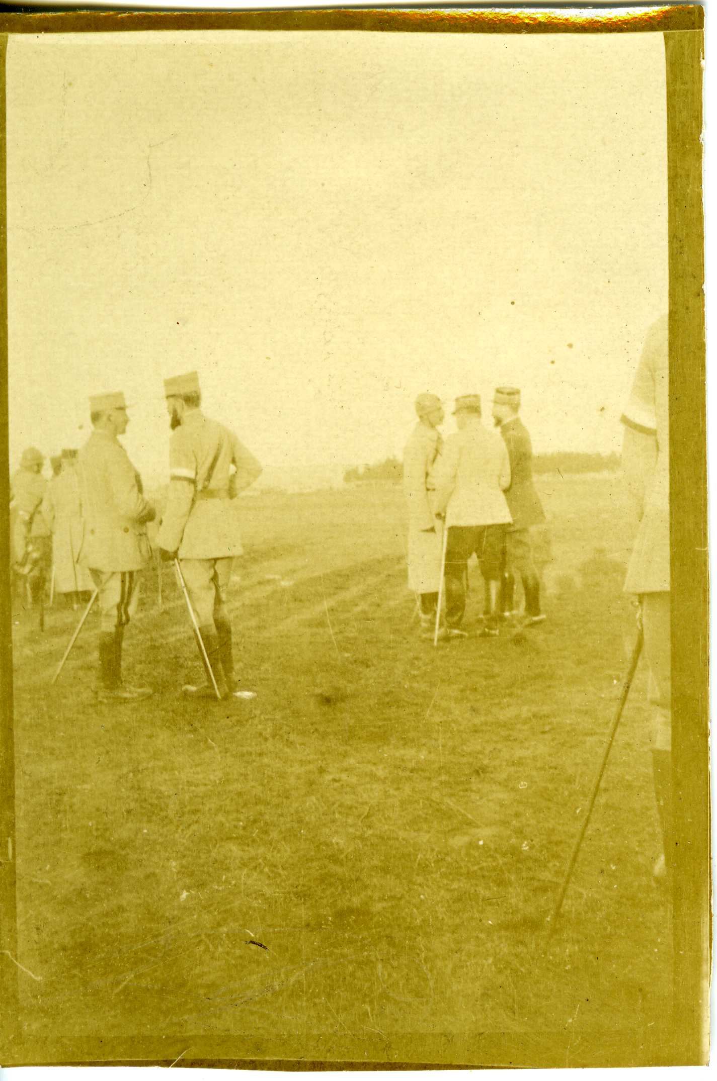 Rassemblement de soldats et de gradés dans un champ. Ils discutent par petits groupes.