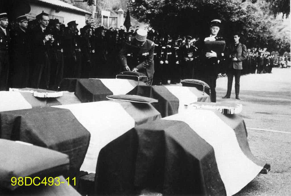 Remise de médailles aux militaires aux gendarmes ou de militaires français morts en Algérie, durant le conflit (1954-1962). Les cercueils sont drapés du drapeau français et alignés.