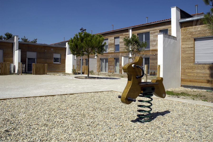 Inscrite dans la géographie des portes du Médoc, cette nouvelle cité-jardin est un projet d’occupation de la parcelle qui offre la possibilité de transformer chaque logement au fil du temps, dans un souci économe et écologique. C’est la notion de confort qui guide le projet tout entier. La surface du logement peut être augmentée de 52 à 80 % par l’accolement de l’espace extérieur – cour, patio, serre et jardin – dans une continuité entre le dedans et le dehors. Un réseau de venelles irrigue le quartier et dessert les logements ainsi que les espaces publics. Les maisons sont déclinées selon deux typologies : la maison à patio et la longère (ensemble de maisons à étage bénéficiant d’une entrée et d’un jardin privatifs, inspirées d’une forme d’habitation traditionnelle du Médoc). Entre des murs et des clôtures, émergent des volumes en boiset des frondaisons d’arbres : autant de caractères qui renvoient au paysage local.