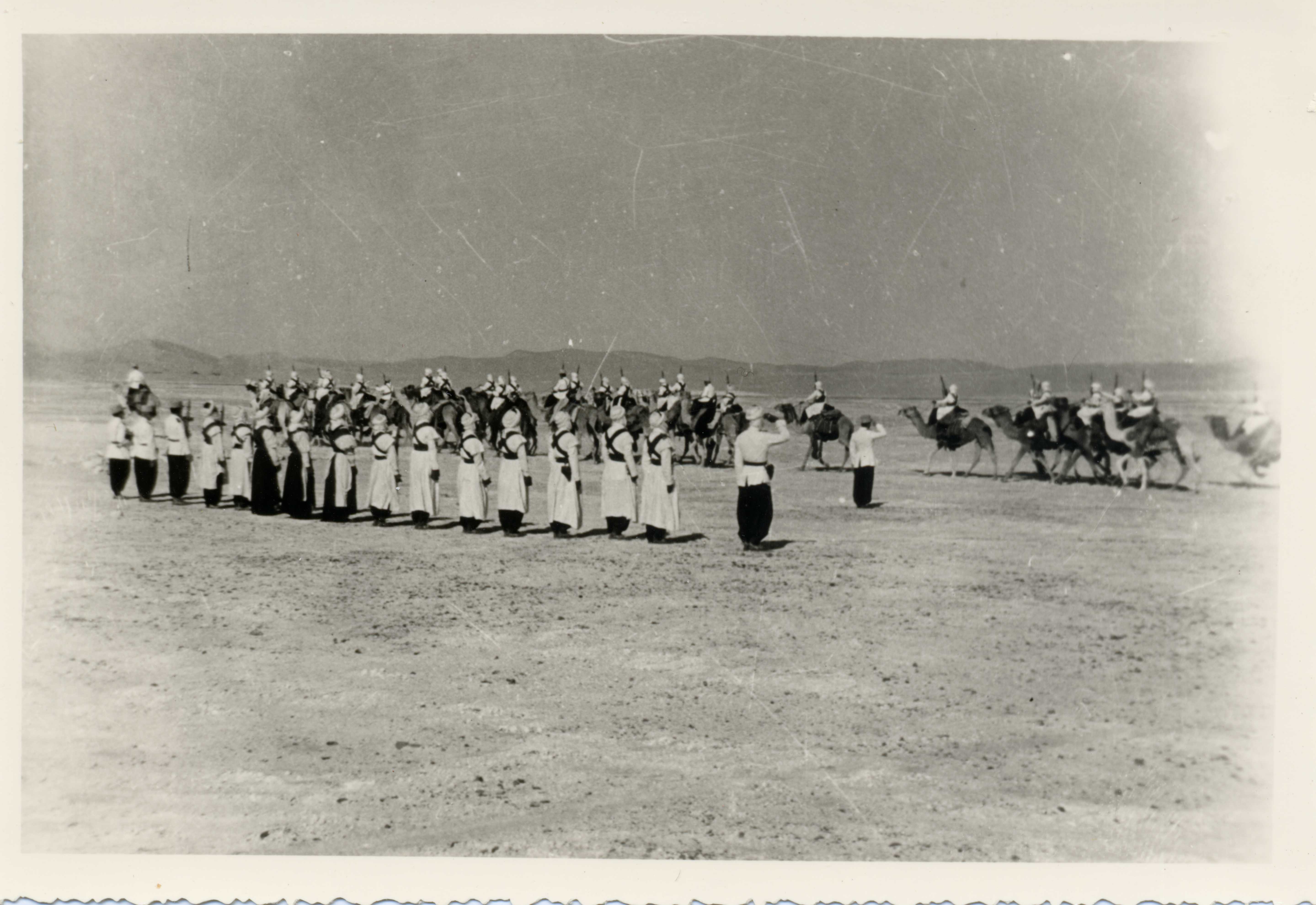 Des hommes à pieds au garde à vous et d'autres à dos de chameaux défilent dans le désert.