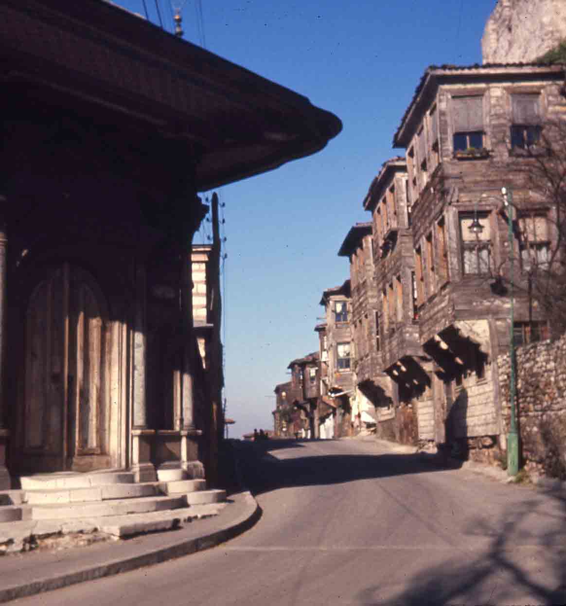 Vue sur une rue d'Istanbul. Maisons en bois, bâtiment sur la gauche.