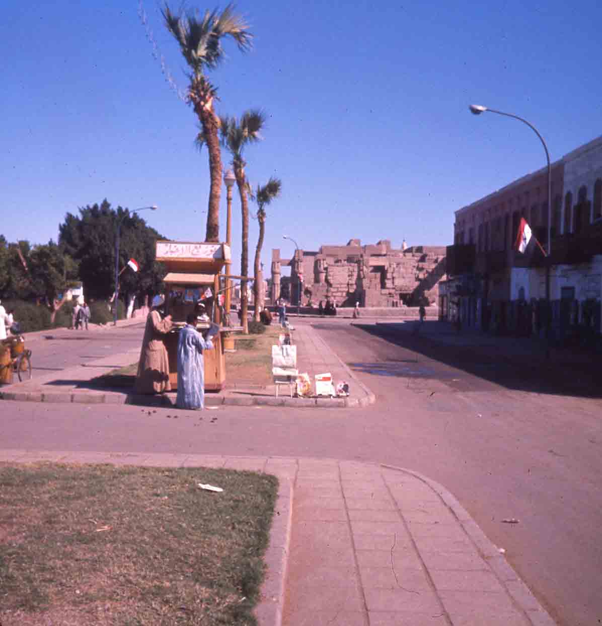 Photo prise dans une rue de Louxor, en Égypte. On peut apercevoir des ruines en arrière plan, et un stand de commerce, sûrement dédié aux touristes.