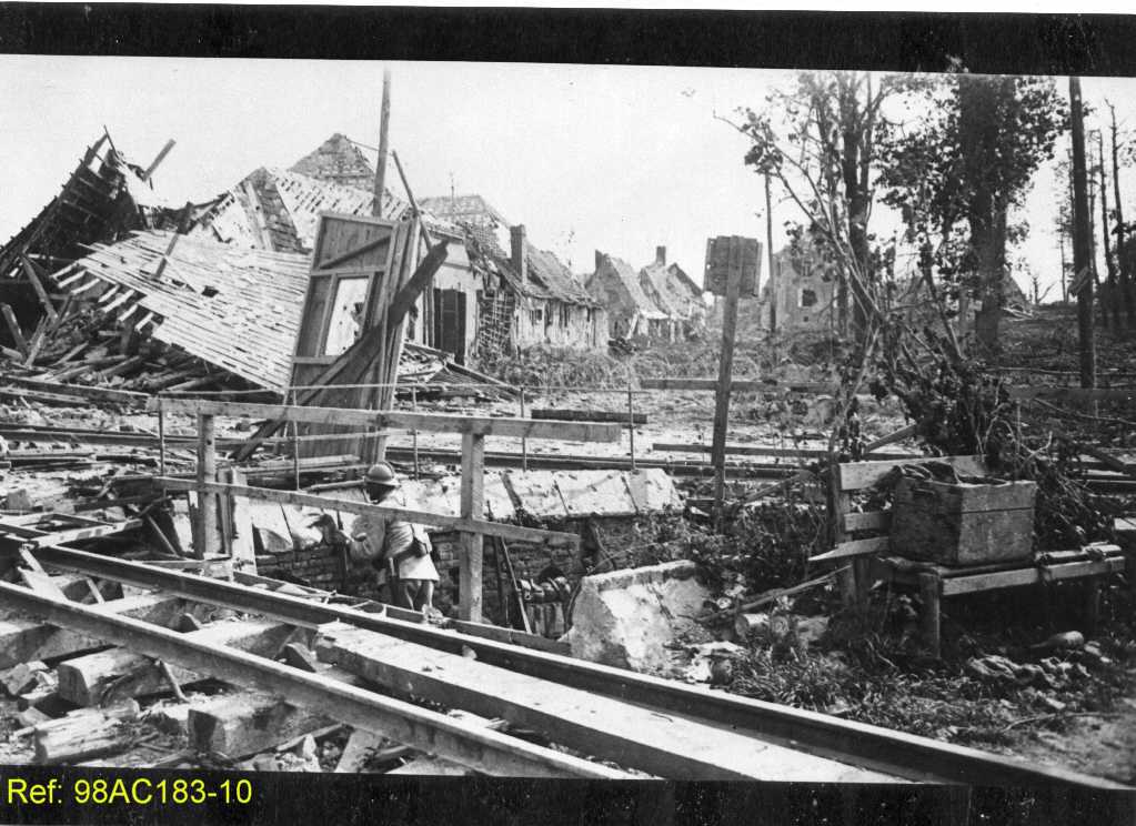 Ruines d'un village de la Somme théâtre de violents affrontements. On y voit un soldat français au milieu des ruines.