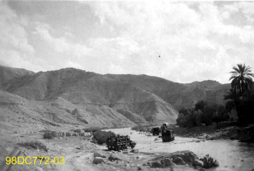 On voit un oued au milieu des montagnes arides en arrière-plan et des palmiers sur la droite.
