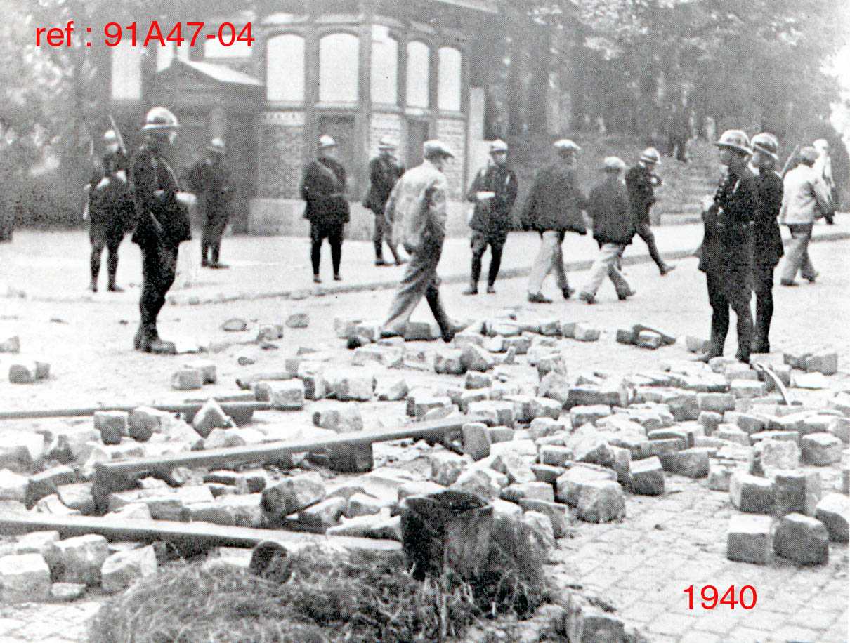 Scène de rue avec des policiers et des civils au milieu de gravats en 1940