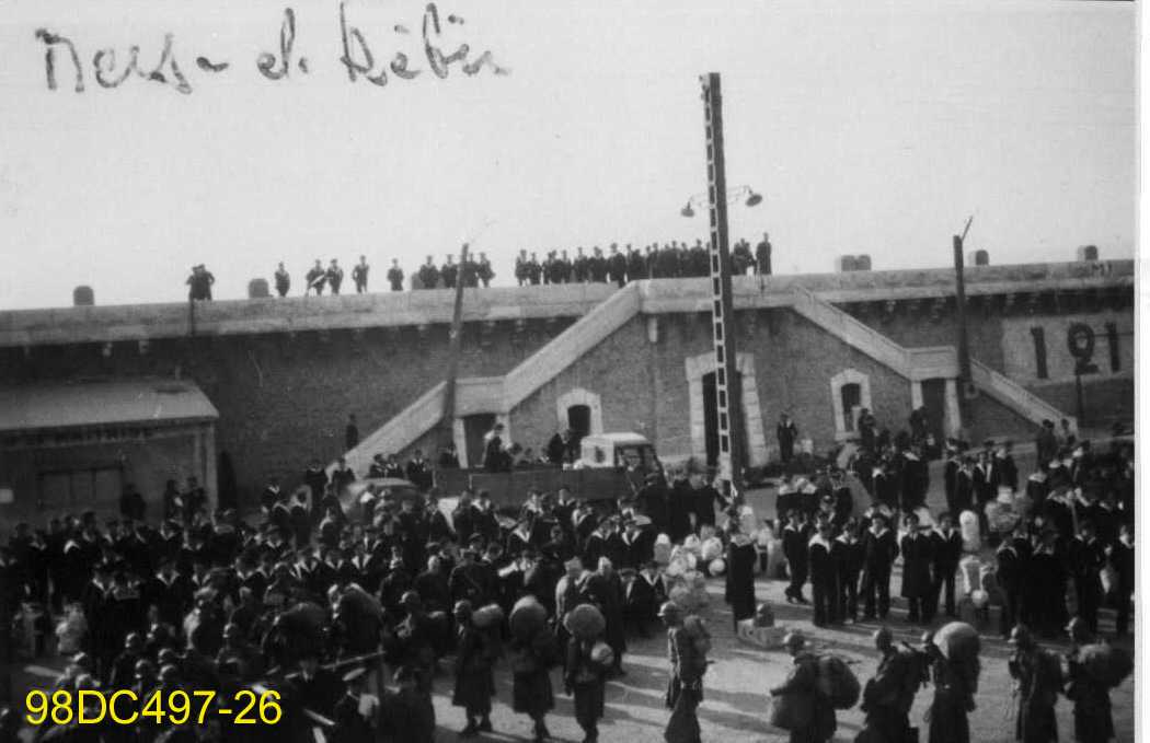 On y voit beaucoup d’hommes en uniforme (probablement des marins ou des soldats), des groupes rassemblés sur le quai et des escaliers menant vers le haut du quai. Des hommes portent des sacs ce qui évoque un embarquement ou un débarquement militaire vers la France ou l'Algérie.