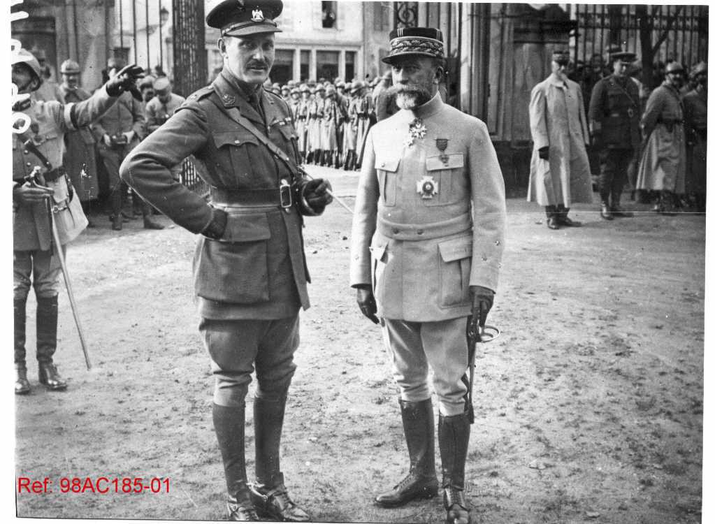 Scène militaire officielle entre un général britannique et un général français pendant la Première Guerre mondiale
