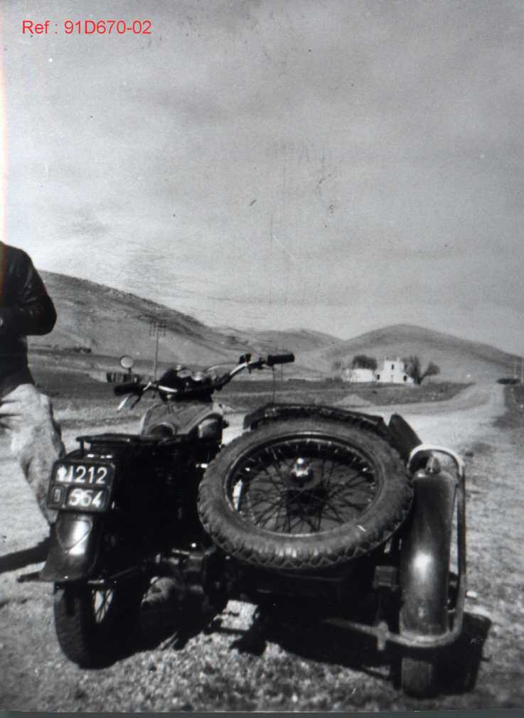 Side-car au bord d'une route. La photo a sans doute été prise en Algérie.