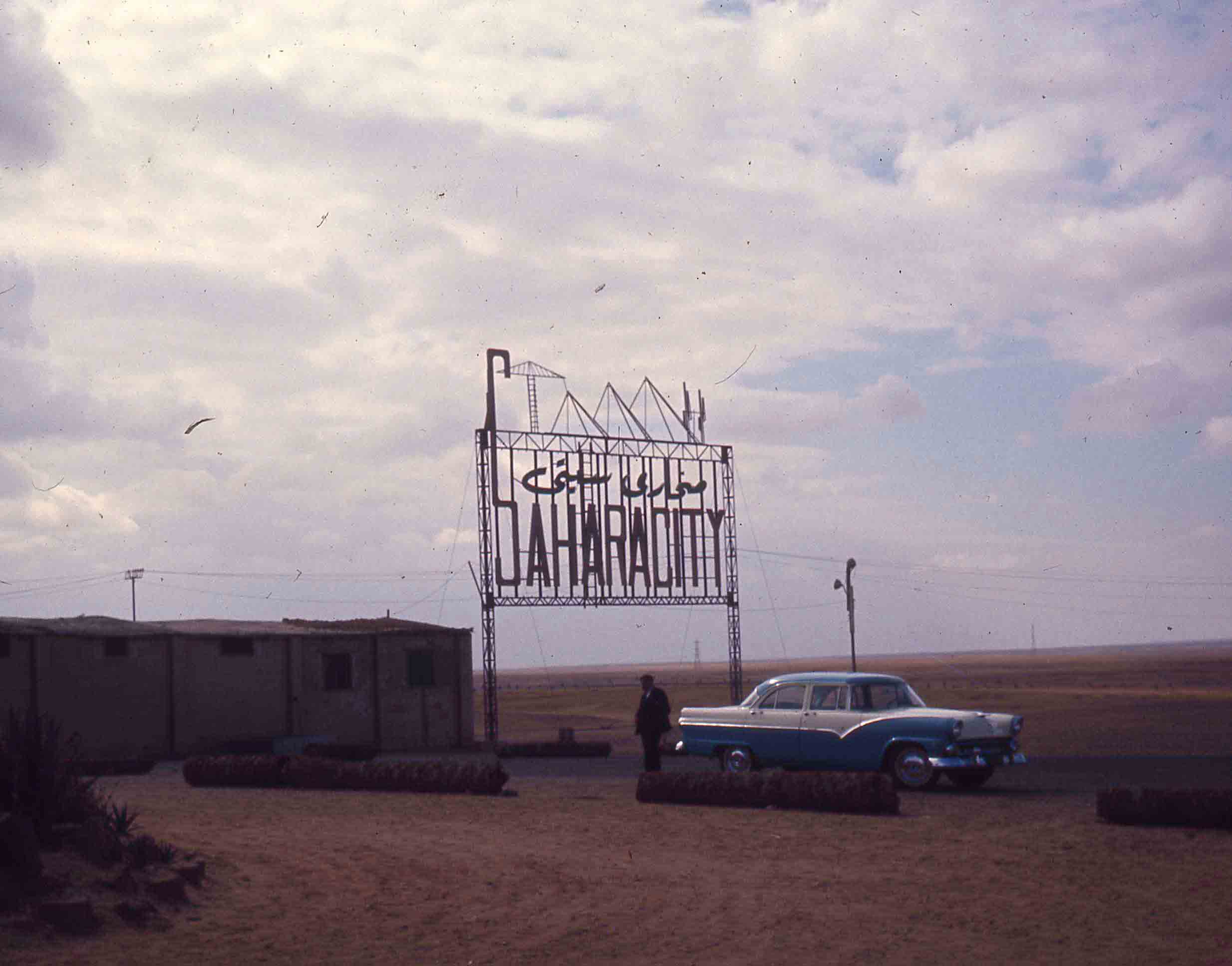 Photo de Georges de Caunes sous un panneau "Sahara City". Il est à côté de sa voiture.