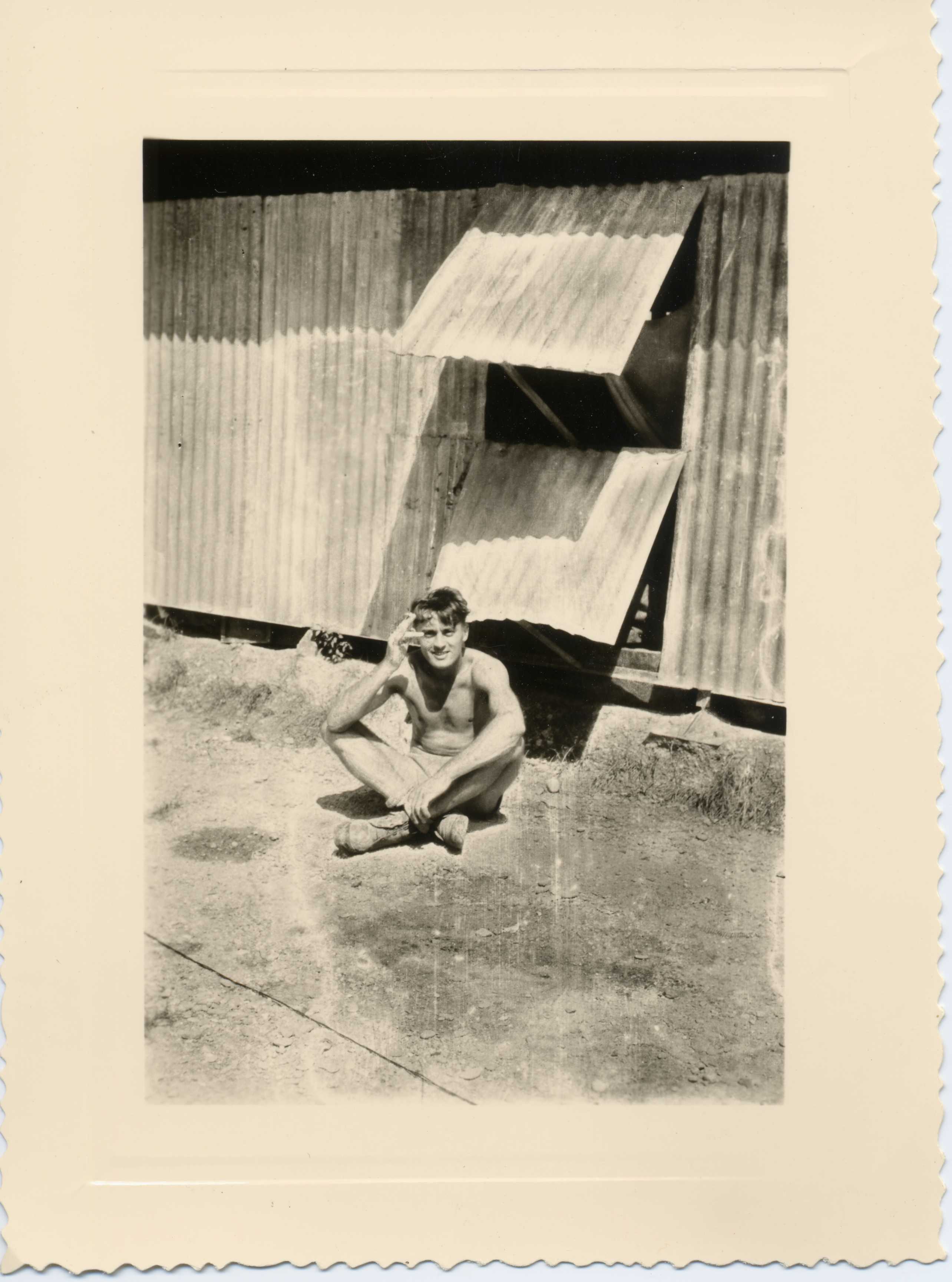 Soldat au repos assis devant une tôle ondulée fume une cigarette.