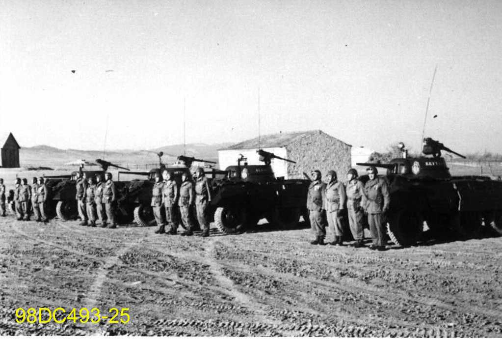 Soldats alignés devant une colonne de véhicules blindés. La photo a certainement prise en Algérie.
