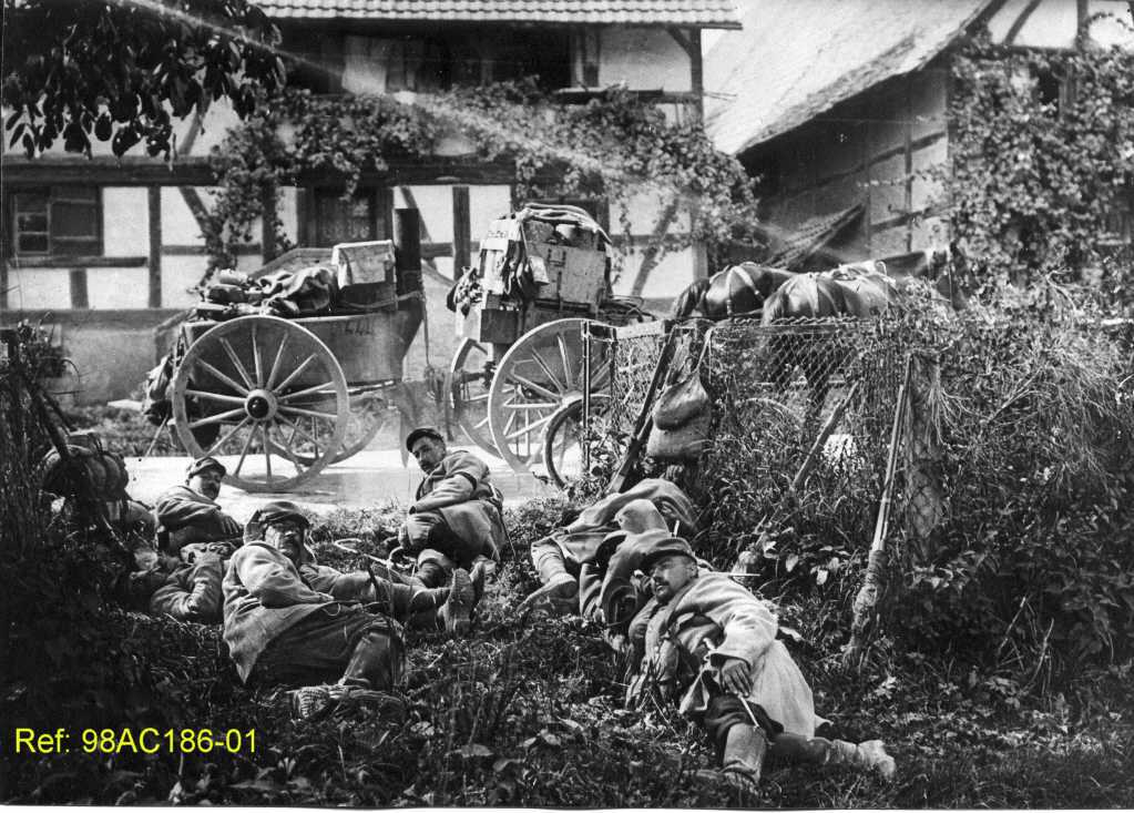 Soldats français au repos sur la route de Dannemarie en Alsace. Ils sont allongés dans l'herbe avec en arrière plan des carrioles remplies de marchandises.