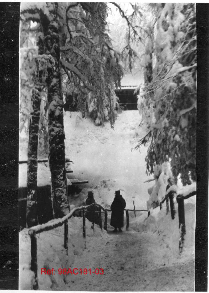 Soldats sur un chemin étroit couvert de neige, bordé de rambardes en bois
