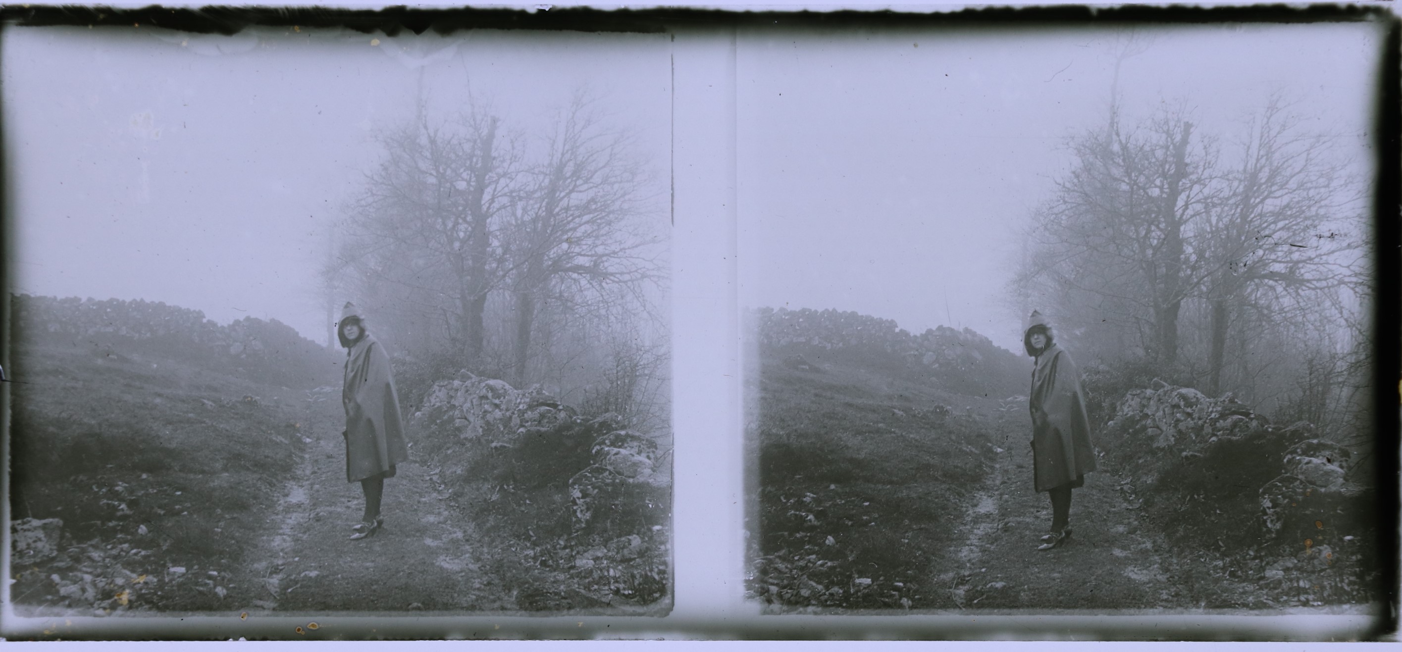 Une femme en imperméable dans la campagne, dans les années 1920.