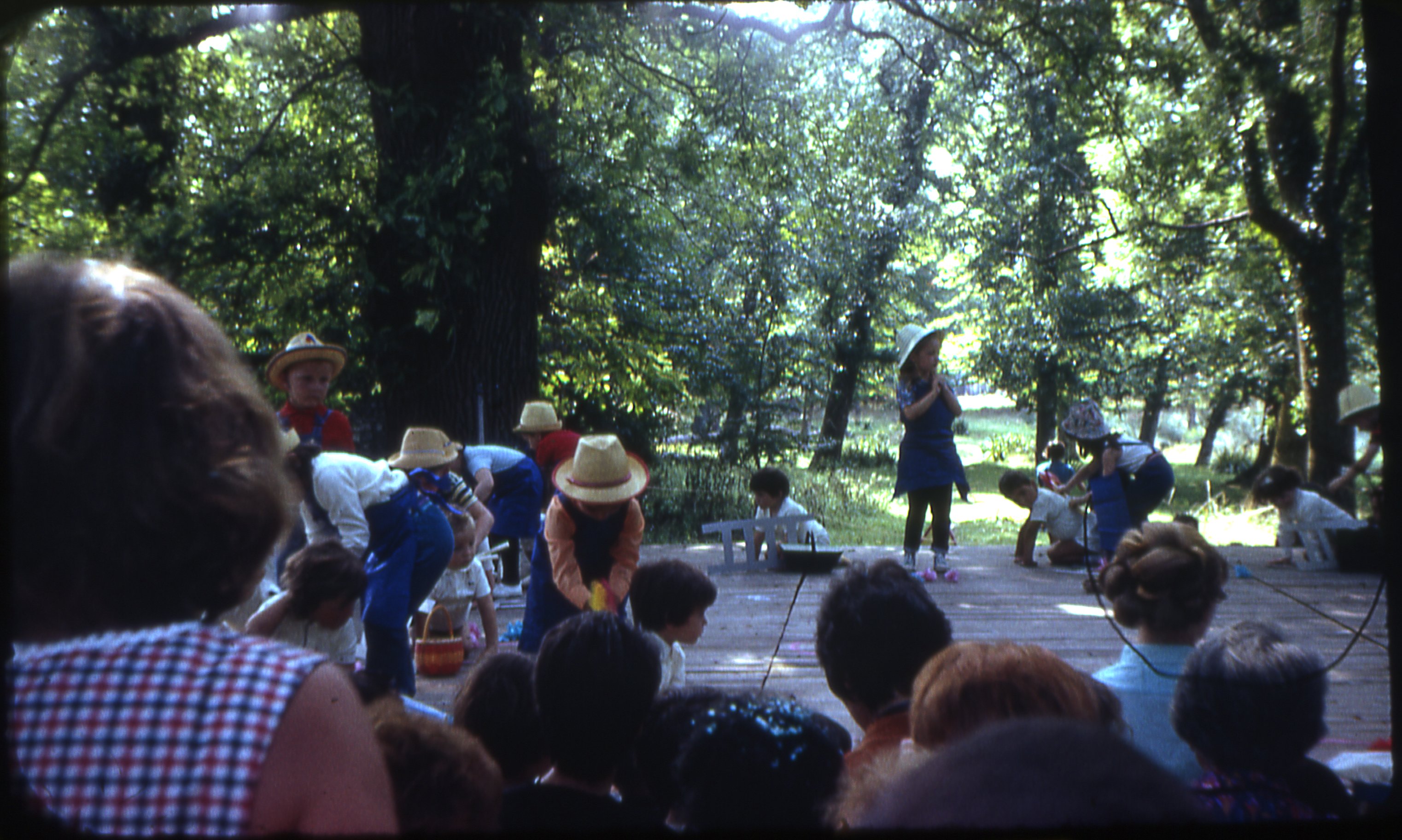 Spectacle avec des enfants déguisés à une kermesse en 1968.