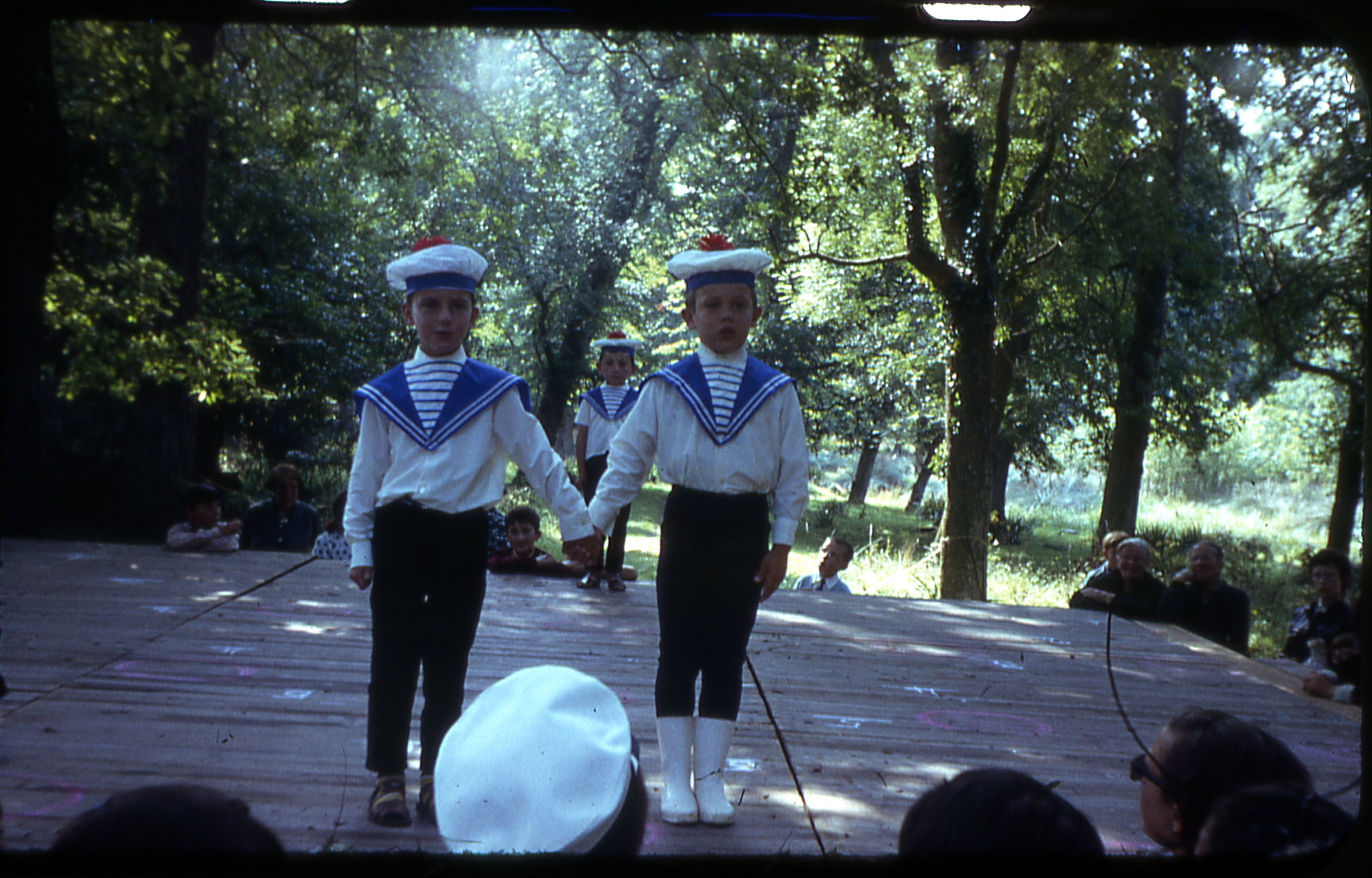 Spectacle avec des enfants en tenue de marin à une Kermesse en 1968