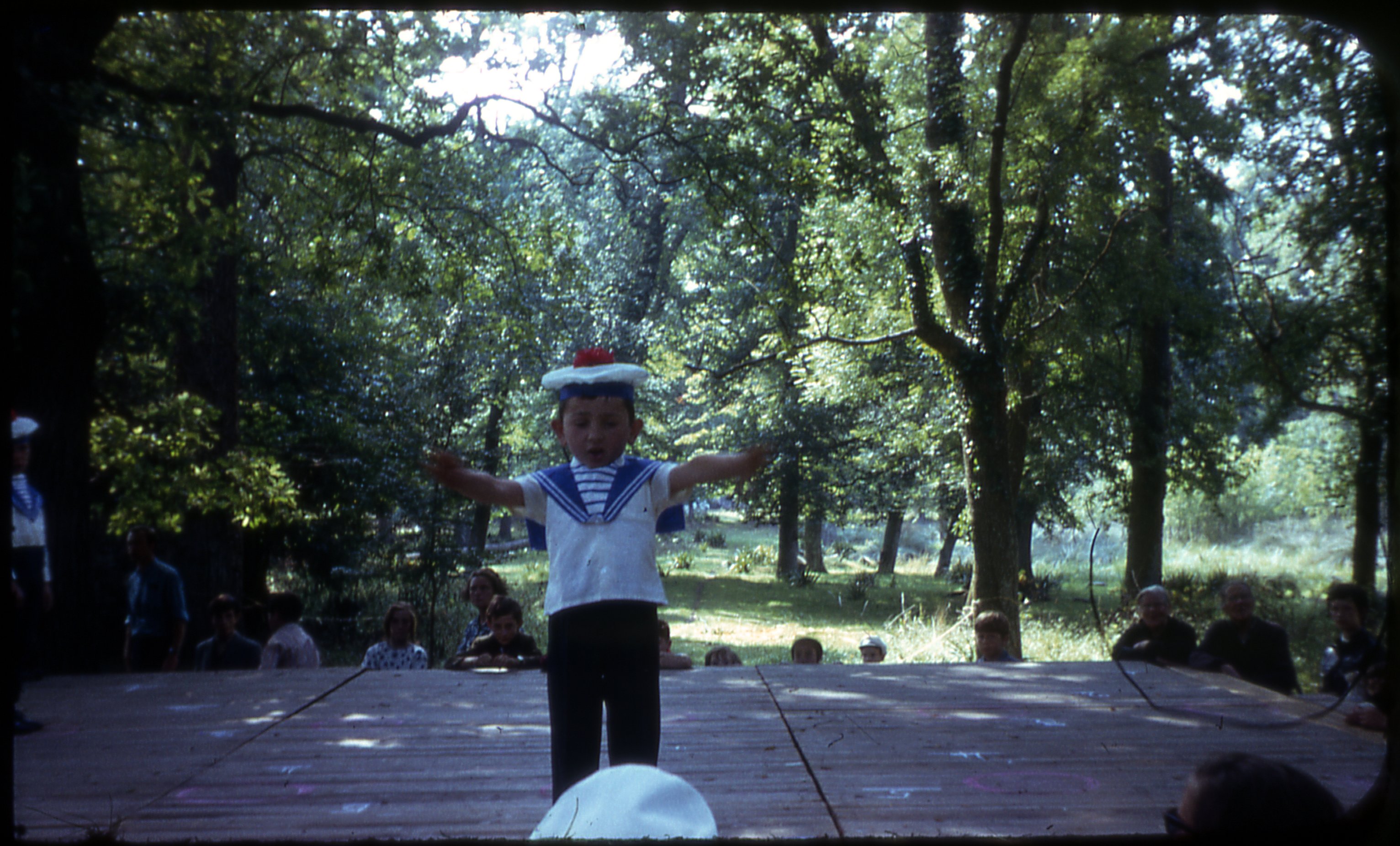Spectacle avec des enfants en tenue de marin à une Kermesse en 1968