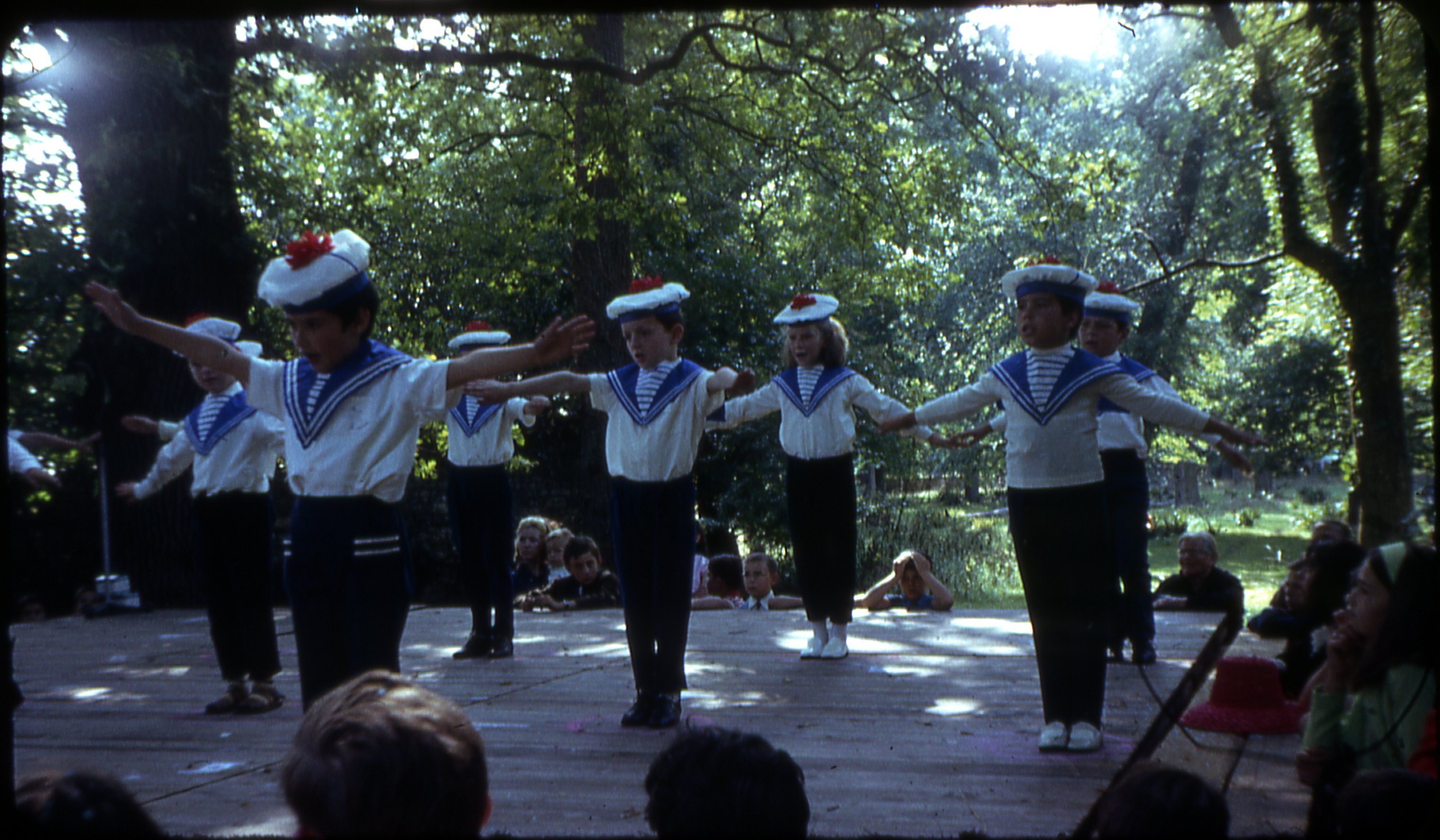 Spectacle avec des enfants en tenue de marin à une Kermesse en 1968