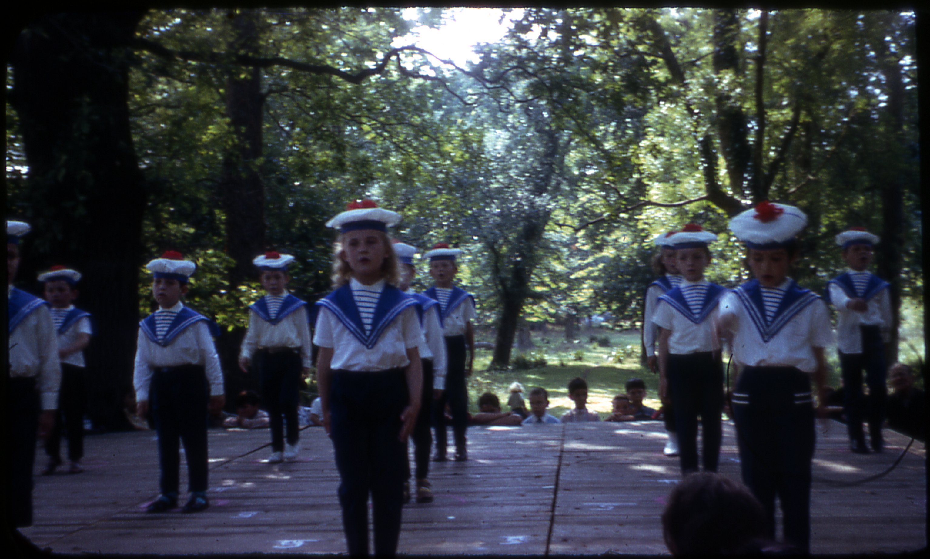 Spectacle avec des enfants en tenue de marin à une Kermesse en 1968