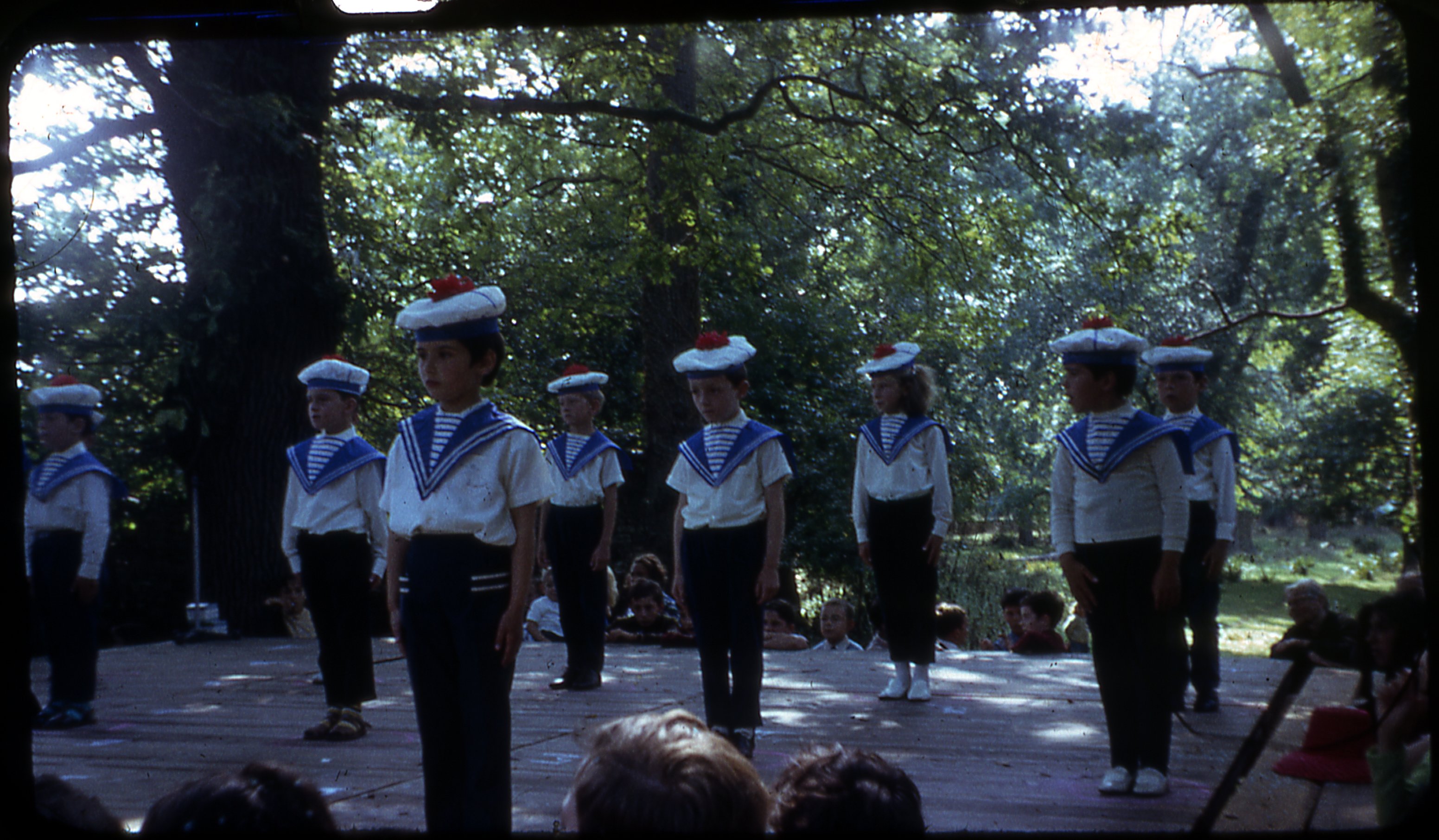 Spectacle avec des enfants en tenue de marin à une Kermesse en 1968
