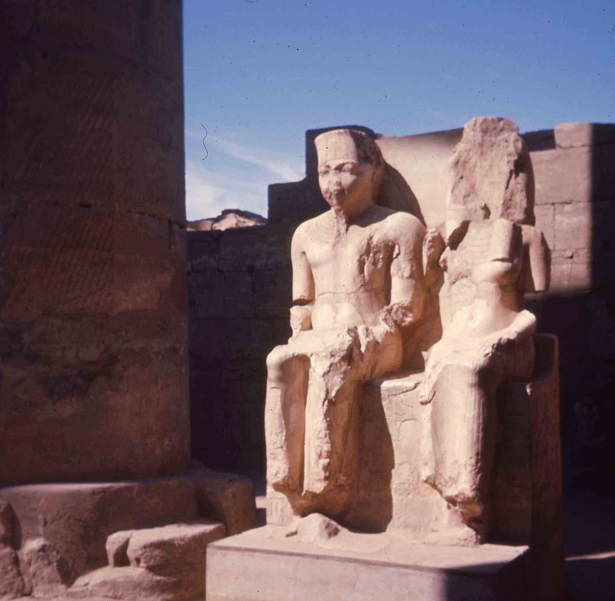 Prise de vue d'une statue représentant Toutânkhamon et sa femme Ânkhesenamon, dans le temple de Louxor. La statue se trouve dans le domaine d'Amon, le seul encore accessible aux visiteurs.