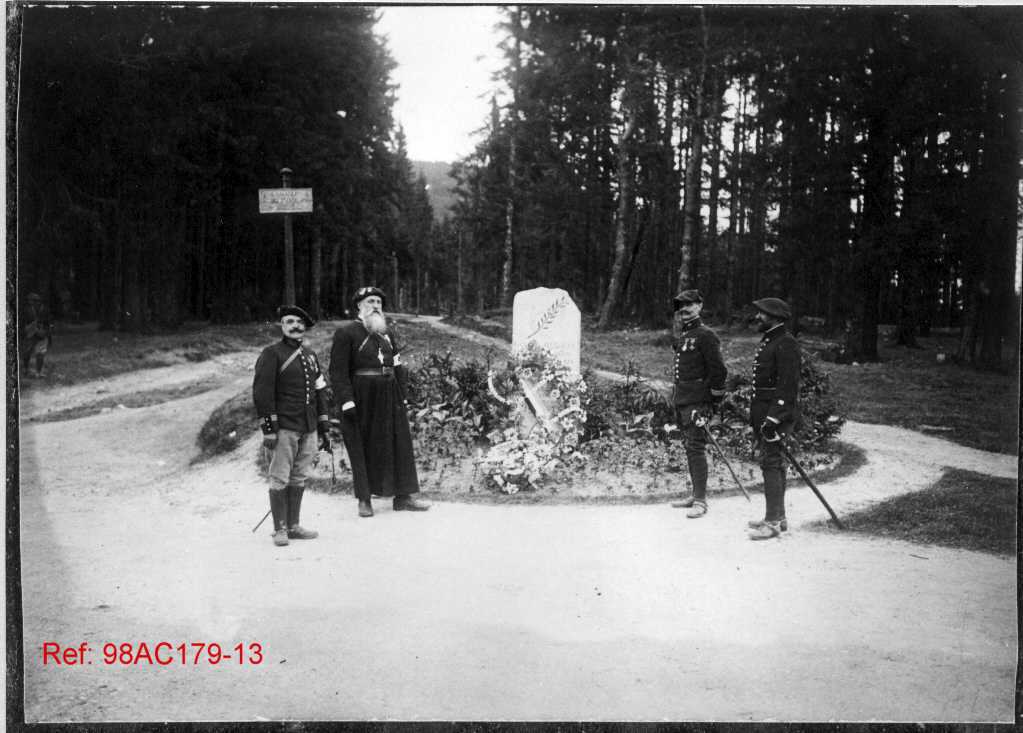 Chasseurs alpins accompagnés d'un homme en tenue religieuse devant une stèle commémorative située à un carrefour forestier au col du Bonhomme.