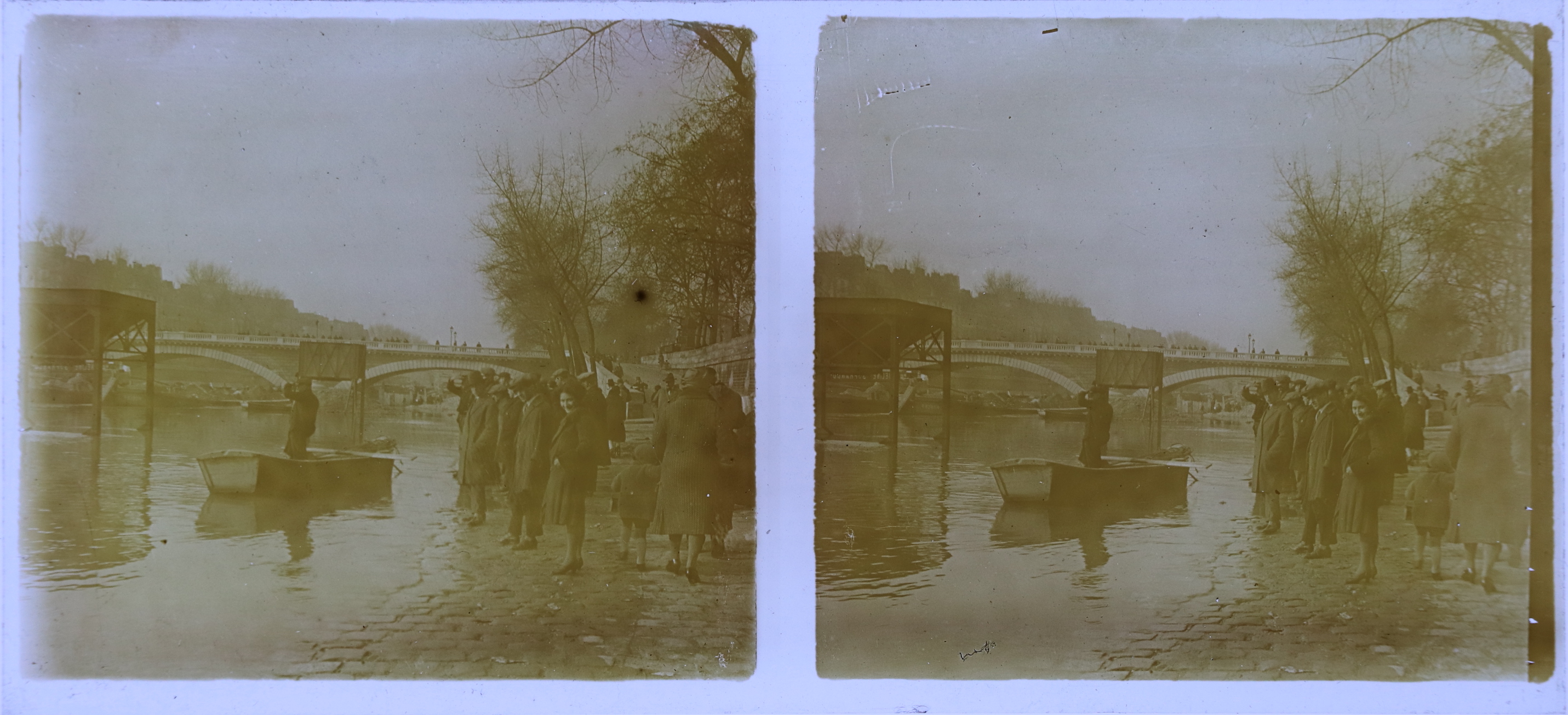 Des curieux observent un événement depuis le quai d'une rivière, dans les années 1940.