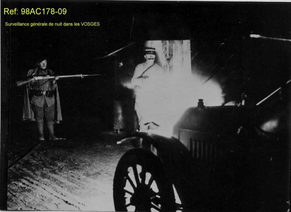 Surveillance générale de nuit dans les Vosges. Il s’agit vraisemblablement d’un poste de contrôle nocturne (surveillance, barrage, contrôle d’identité ou de circulation).