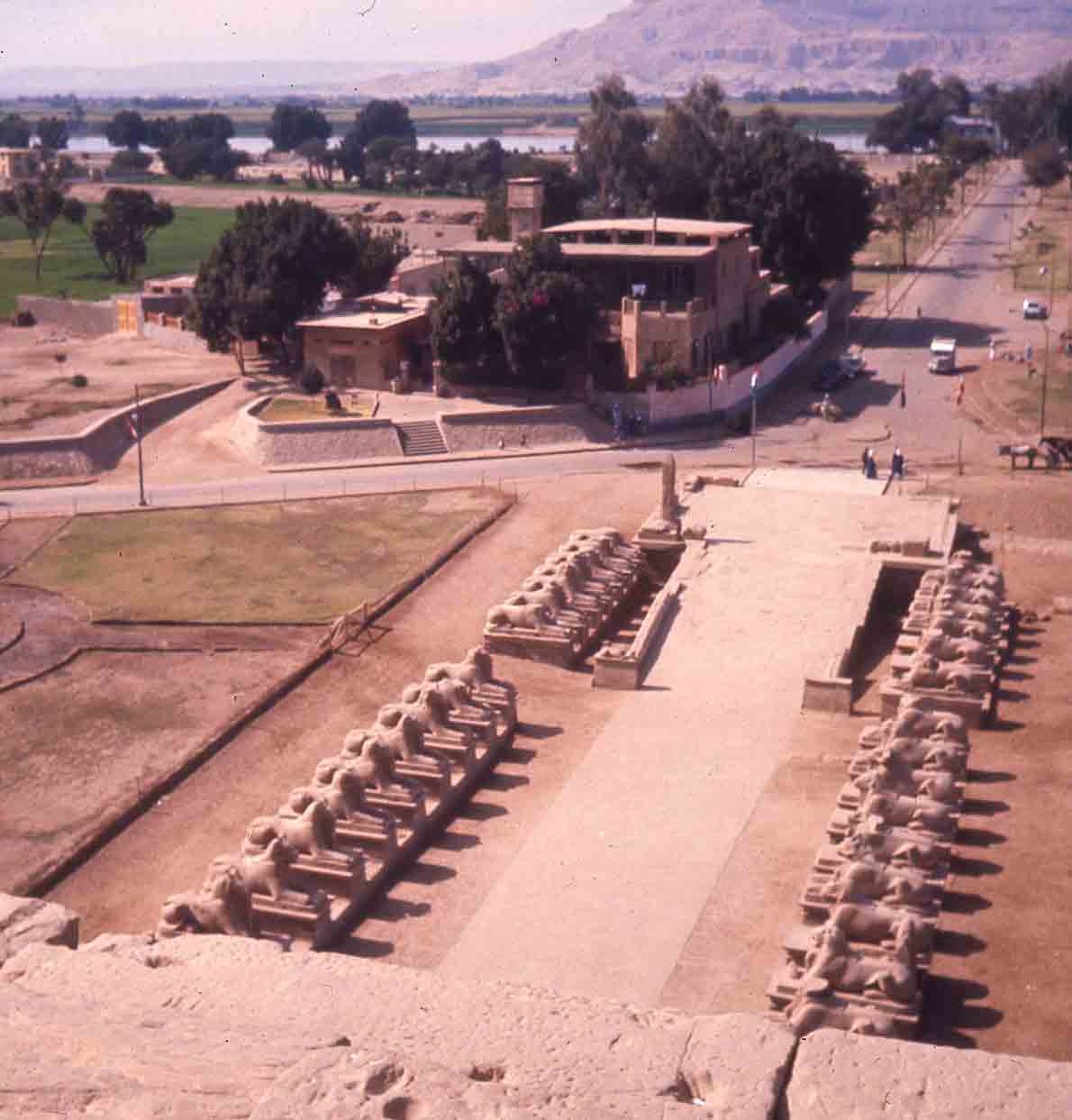 Photo prise du haut du temple d'Amon, à Karnak. On y voit l'allée des Sphinx et une route de Louxor, menant au temple.