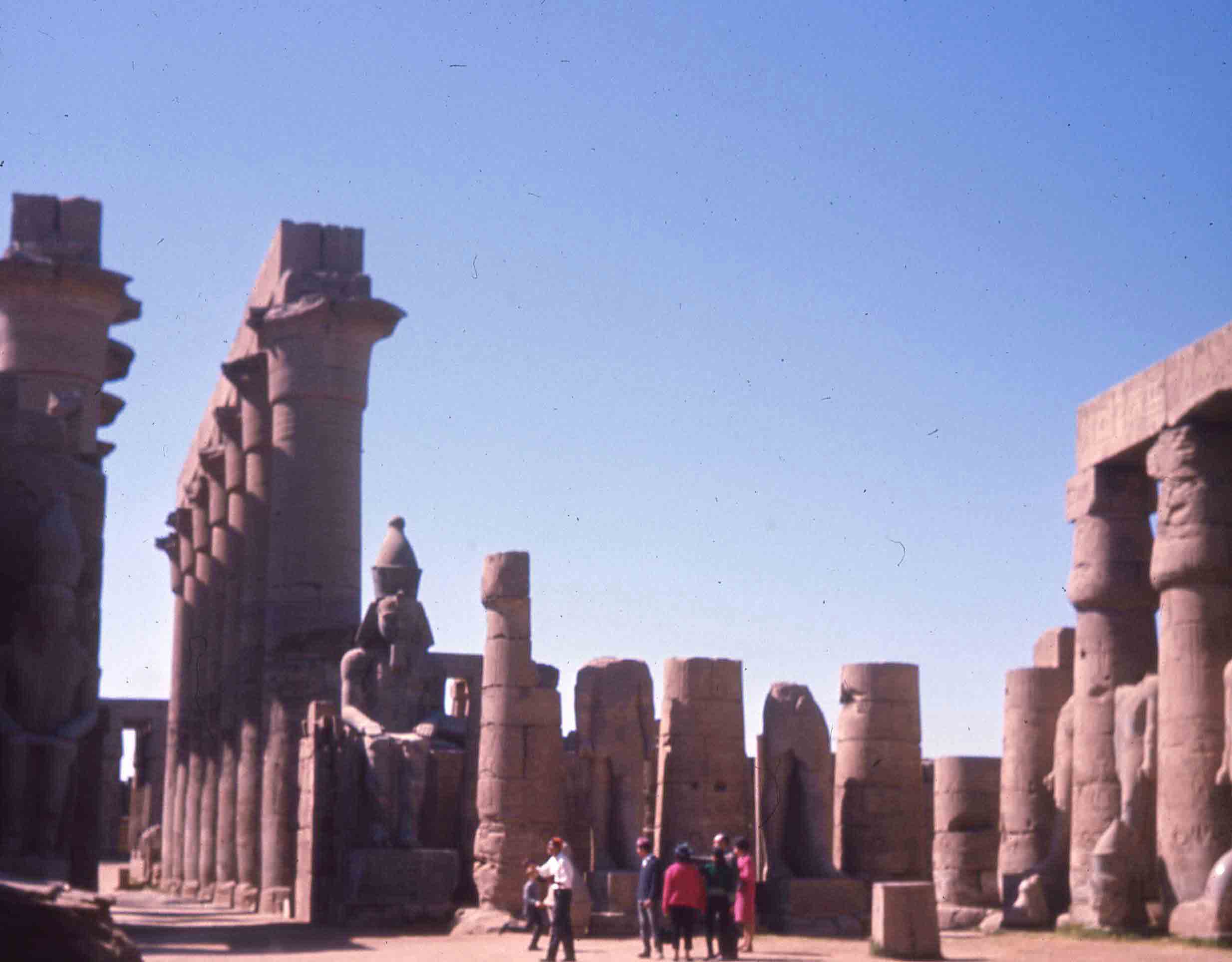 Prise de vue du site de Karnak avec de grandes colonnes, à Louxor. Quelques touristes, et une statue royale, assez sombre.