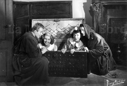 Reportage de quatre photos sur le tournage du film d'Emile Couzinet, de 1950 : Trois marins dans un couvent.