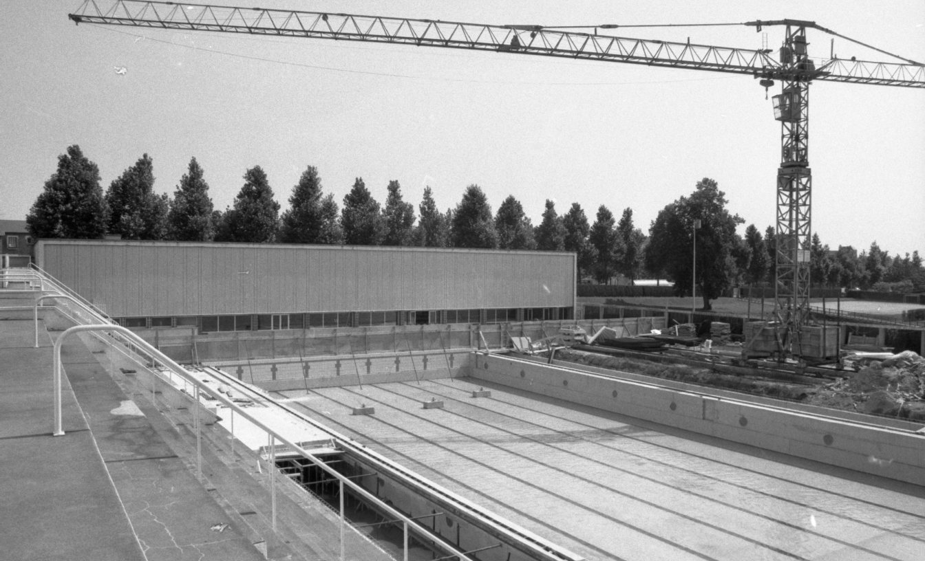 Les travaux dans les bassins extérieurs de la piscine de Beaublanc, à Limoges, en août 1991.