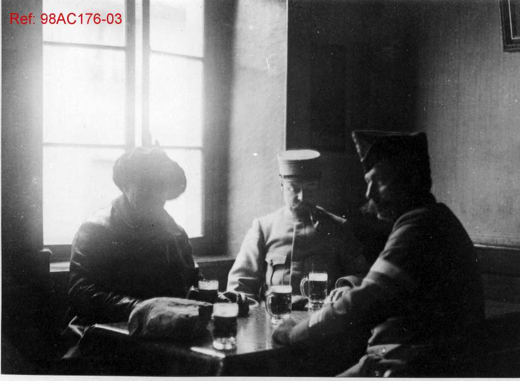 Trois hommes en uniforme militaire assis autour d’une table, dans un café, en train de boire de la bière.