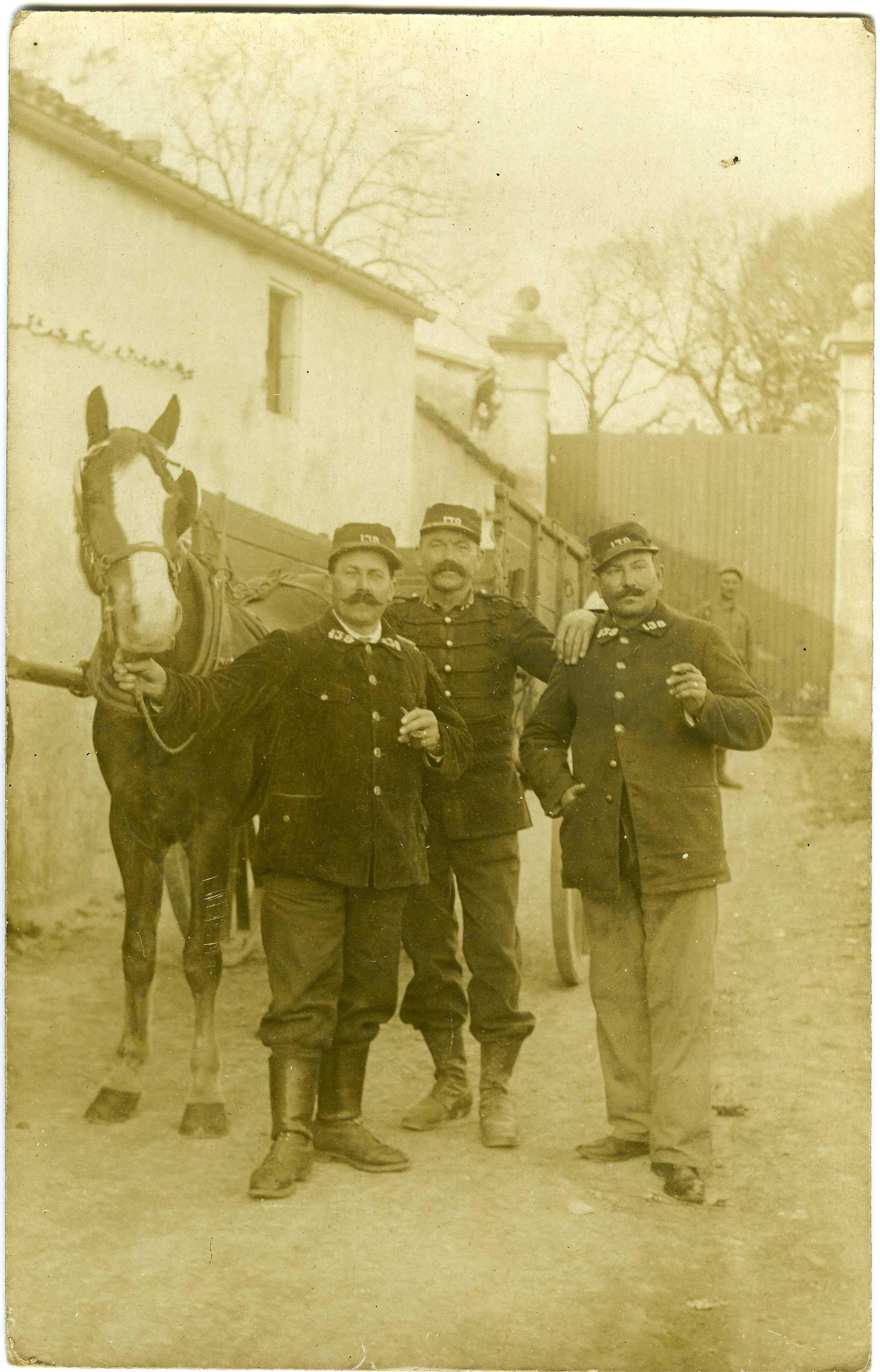 Sur leurs képis, on distingue les lettres "T.D." (très probablement pour Train des Équipages), une unité logistique de l’armée française chargée du transport de matériel, de vivres, et de munitions par convois (souvent hippomobiles). Les cols des vestes portent aussi des numéros ou lettres, confirmant leur appartenance au Train. Le cheval est harnaché pour tirer un chariot militaire.
