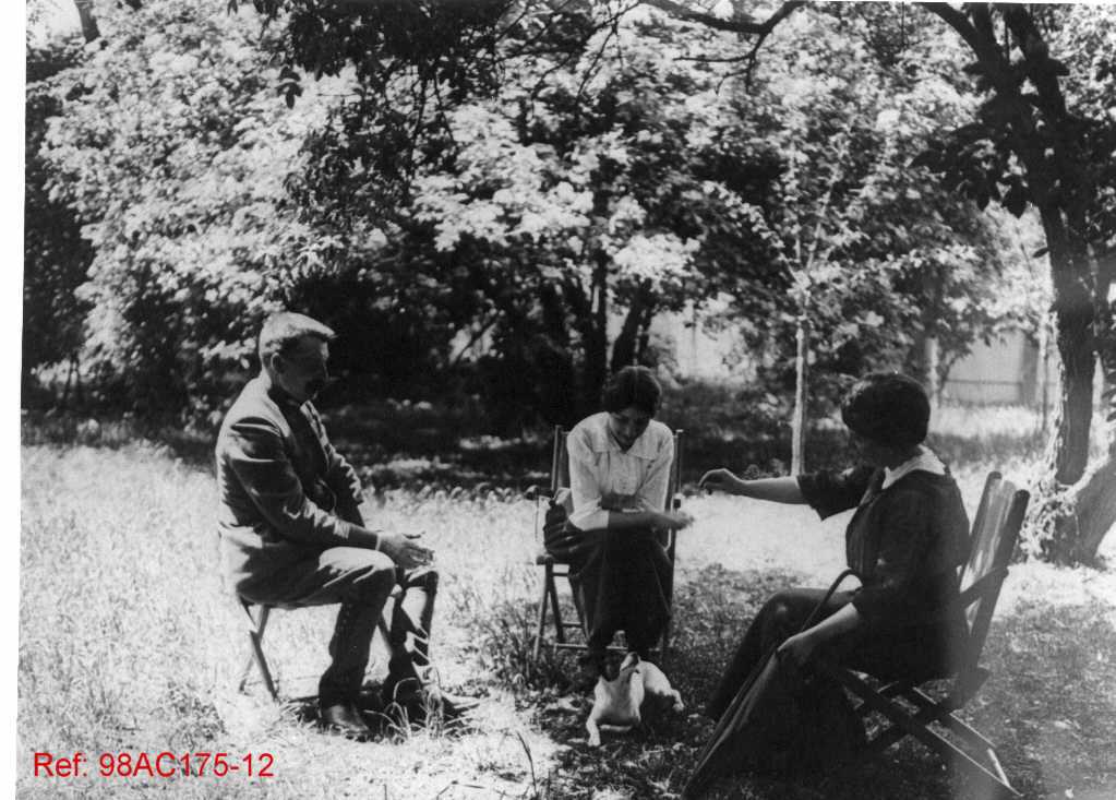 Trois personnes sont assises à l’extérieur, dans un jardin ou un verger, à l’ombre des arbres