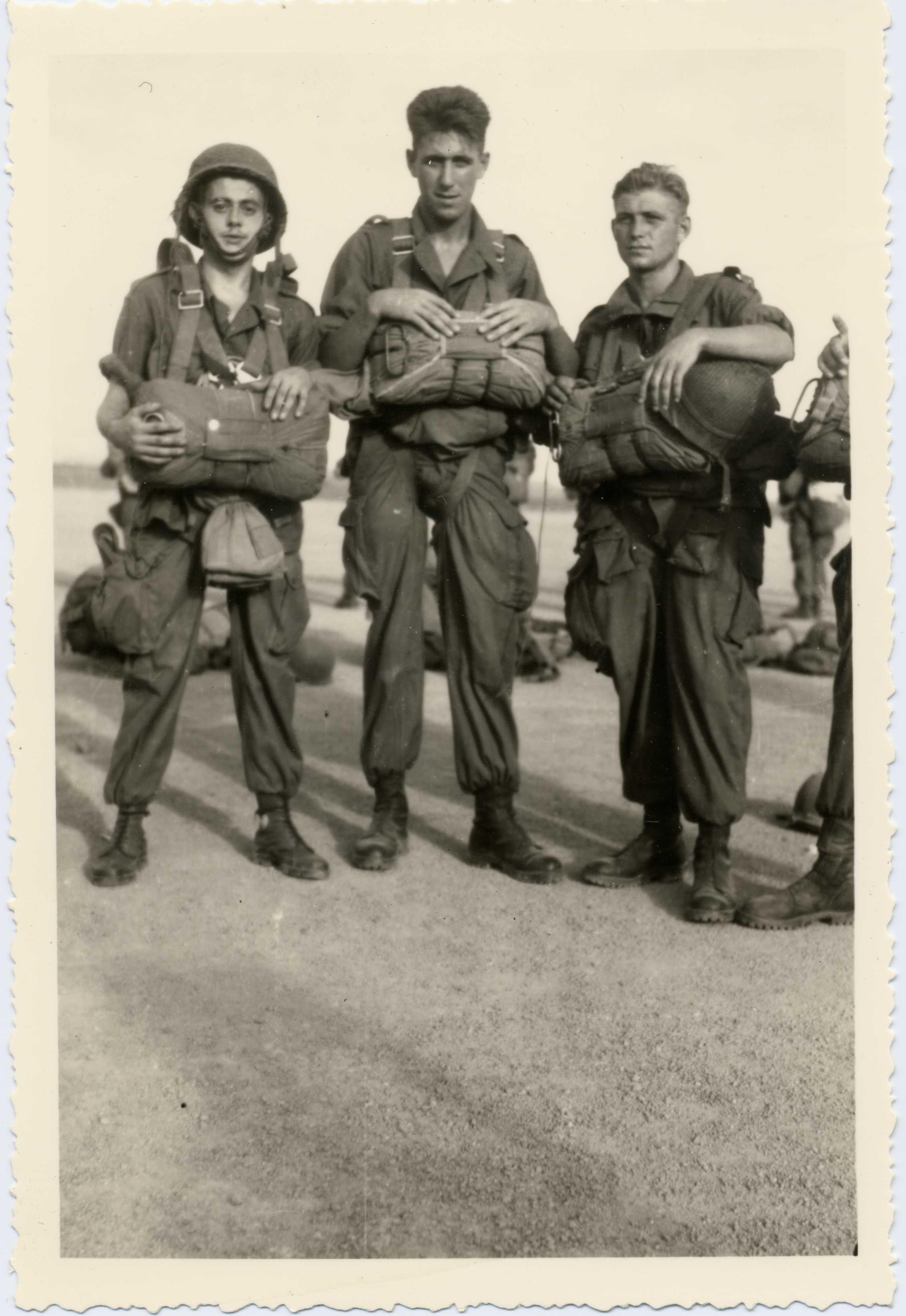 Trois hommes posent en uniforme. Ils semblent tous les trois être des parachutistes. La photo serait prise sur une base aérienne.