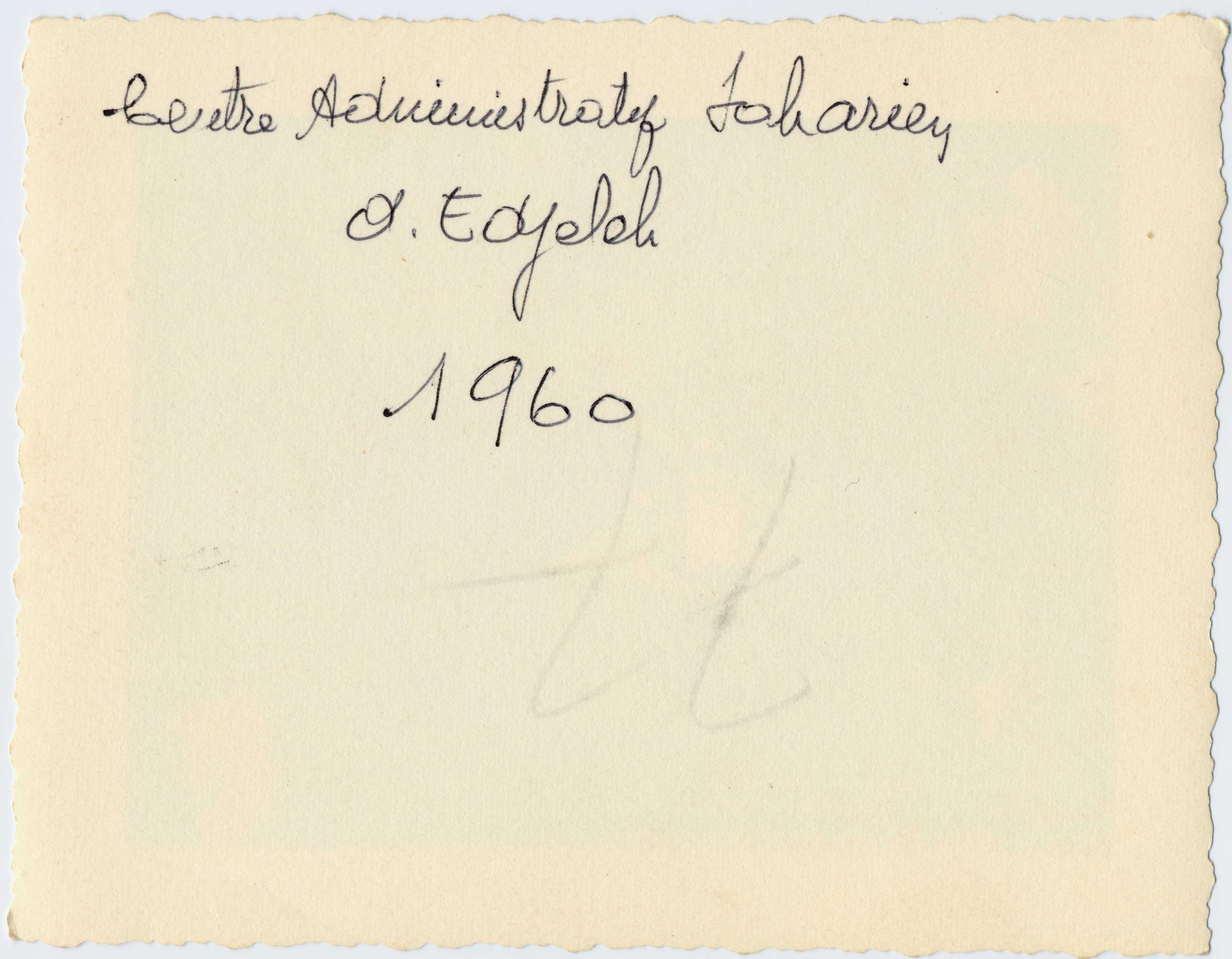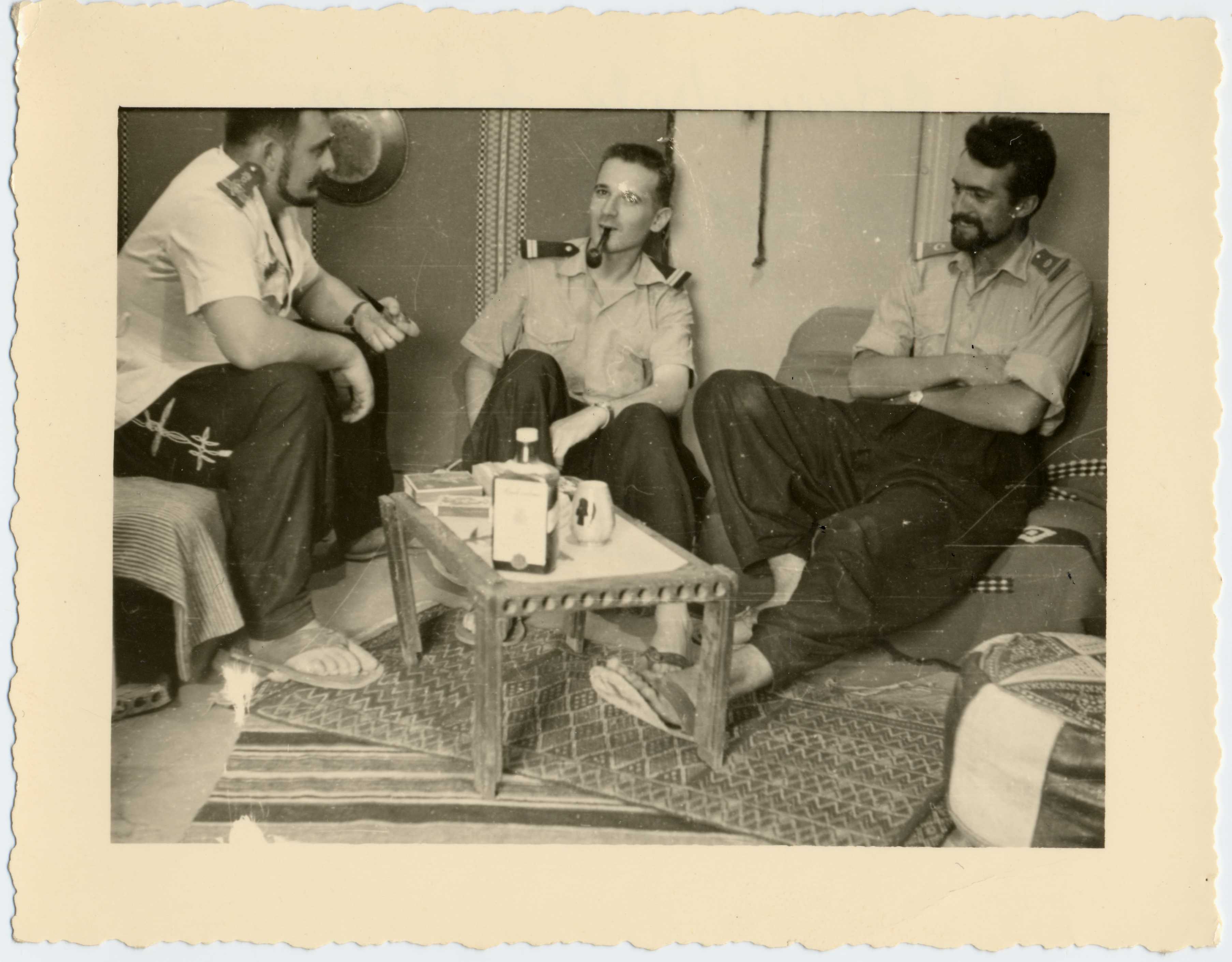 Trois soldats prennent l'apéritif autour d'une table au centre administratif d'Edjeleh en 1960