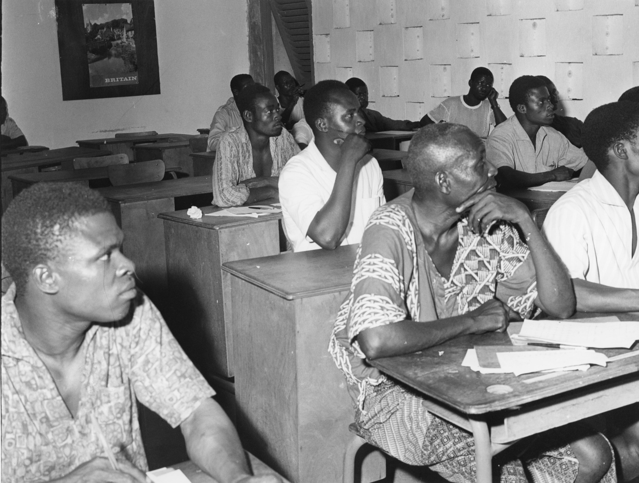 En Côte d'Ivoire, des participants à un cours d'alphabétisation regardent un programme pédagogique dans une salle de classe, dans les années 1960.