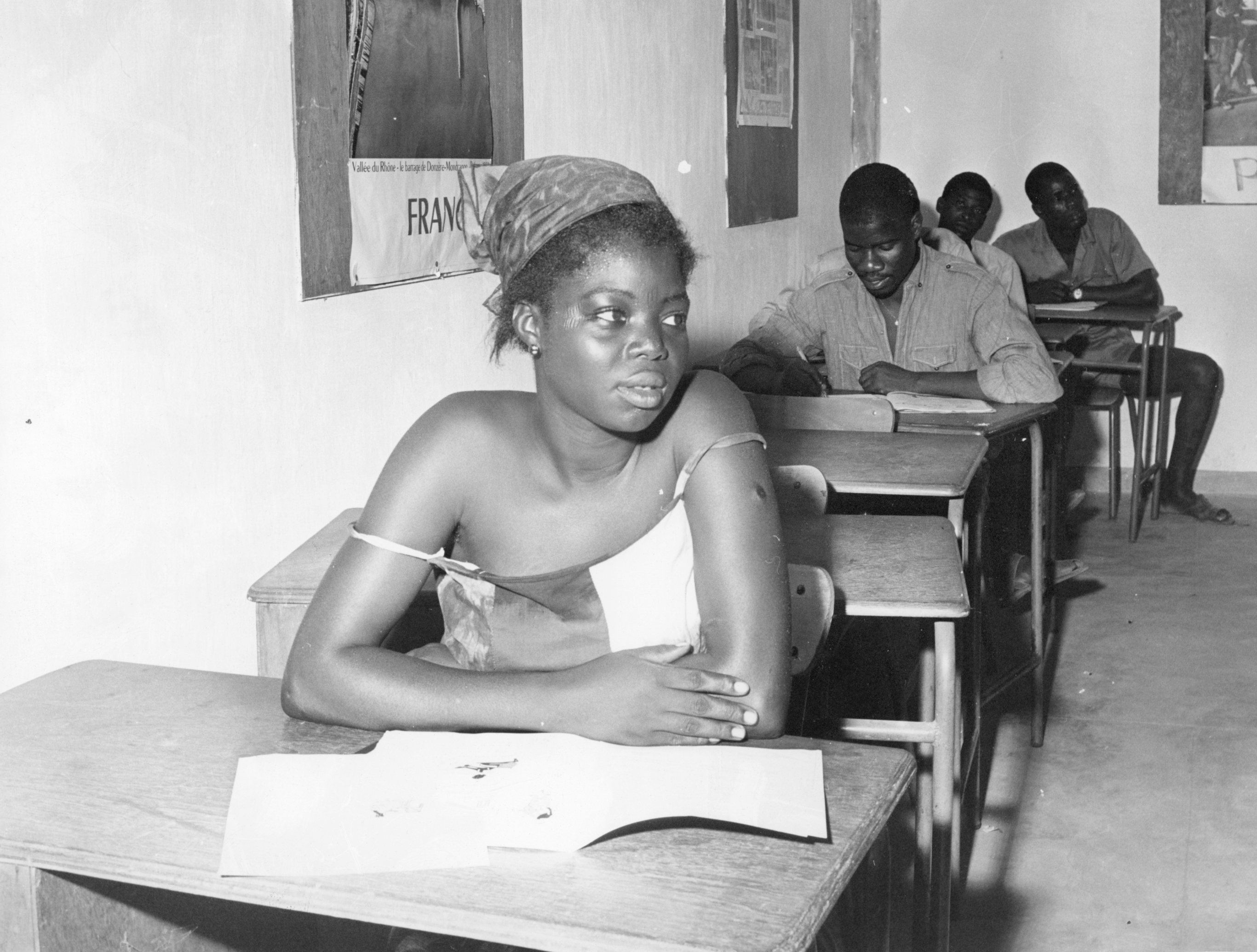 Le portrait d'une Ivoirienne dans une classe, lors d'un cours d'alphabétisation en Côte d'Ivoire, dans les années 1960.