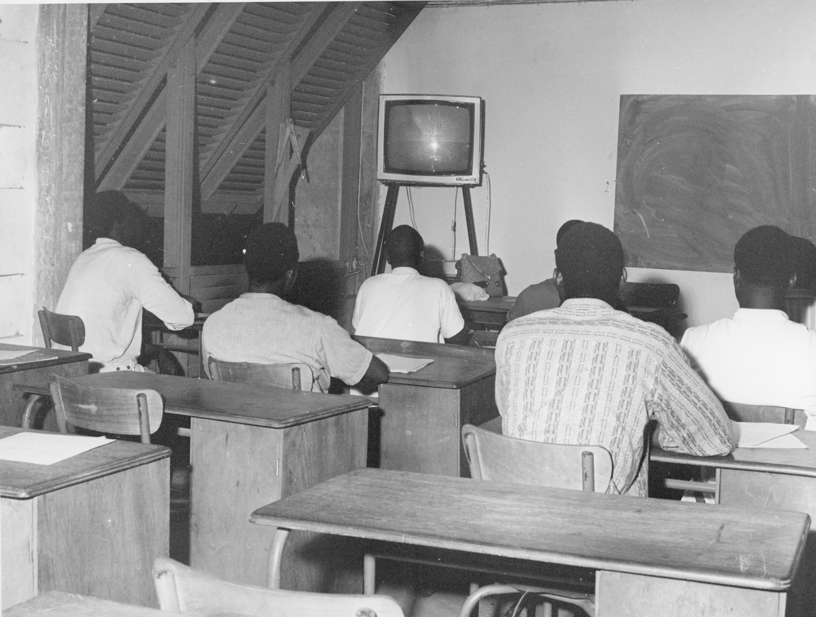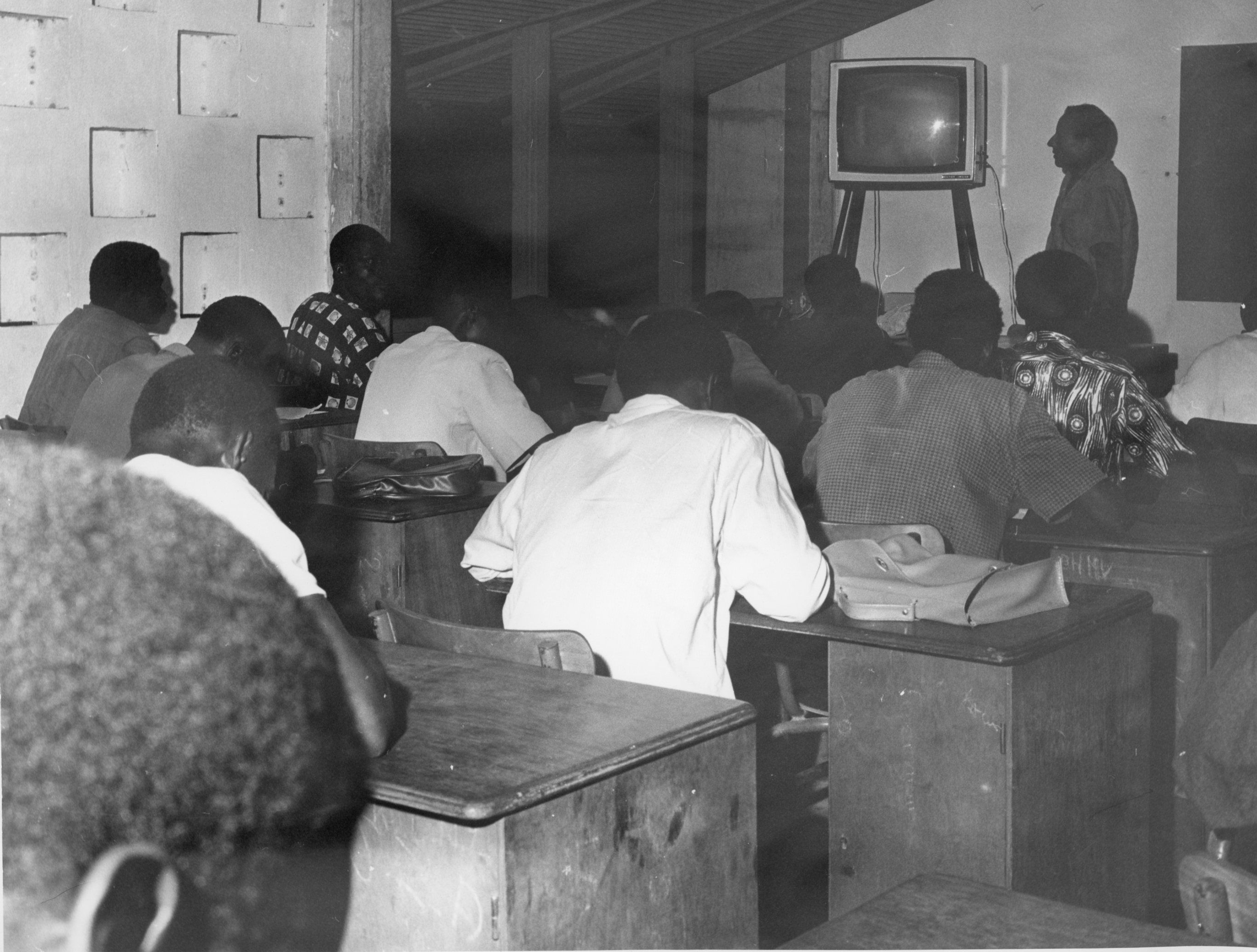 Lors d'un cours d'alphabétisation dans une salle de classe, en Côte d'Ivoire, dans les années 1960.