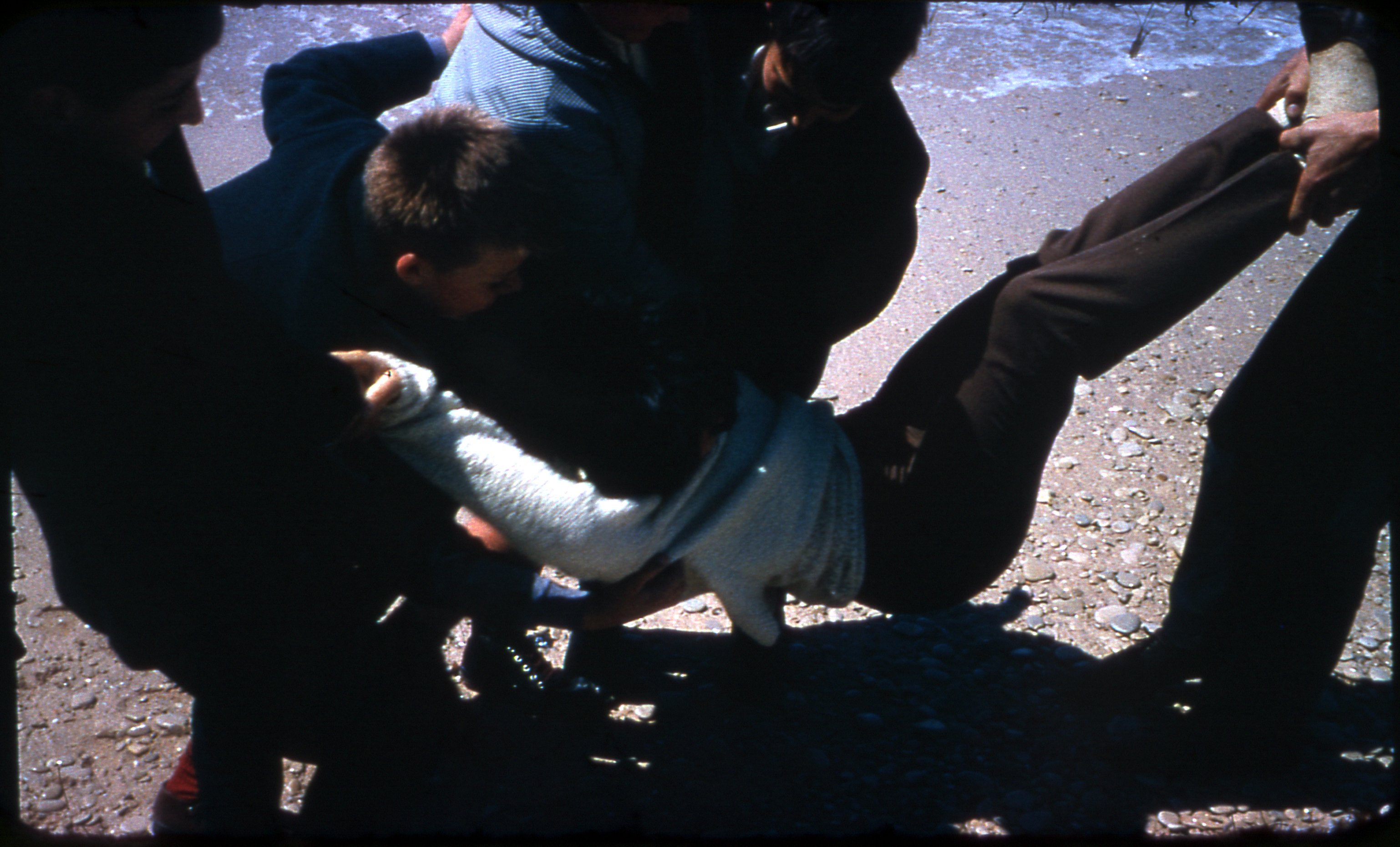 Un garçon se fait trainer vers la mer sur la plage à l'Houmeau en 1969