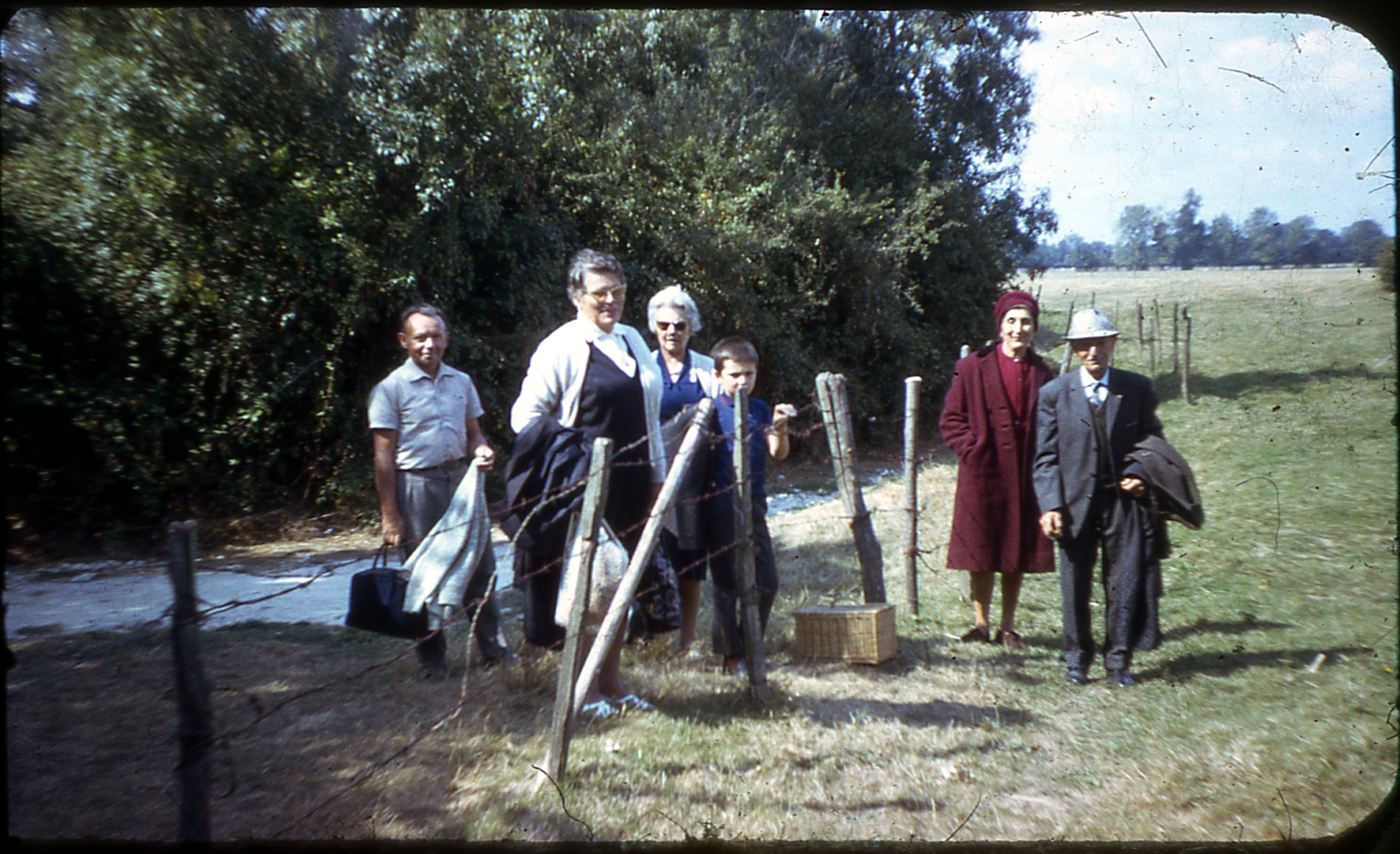 Un groupe de personnes âgées avec un jeune garçon à la campagne en 1967.