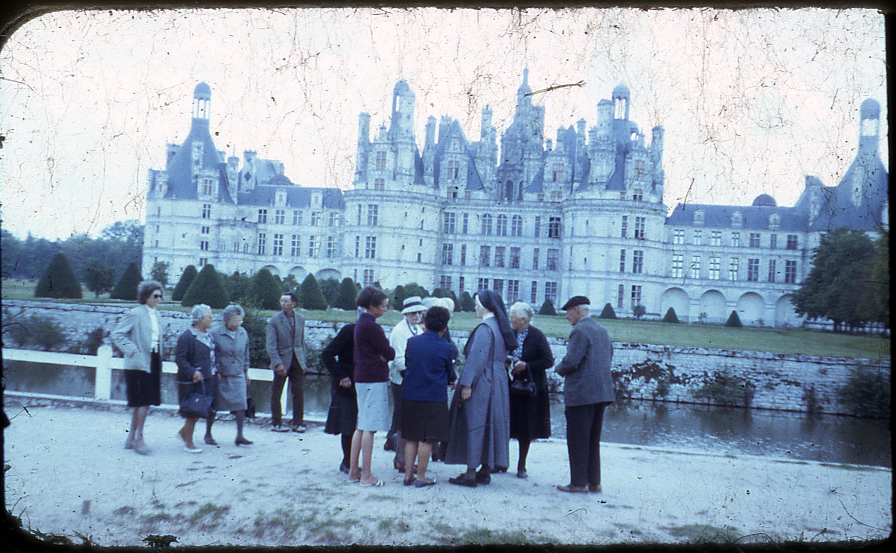 Un groupe de personnes devant le château de Chambord dans le Loir-et-Cher dans les années 1960