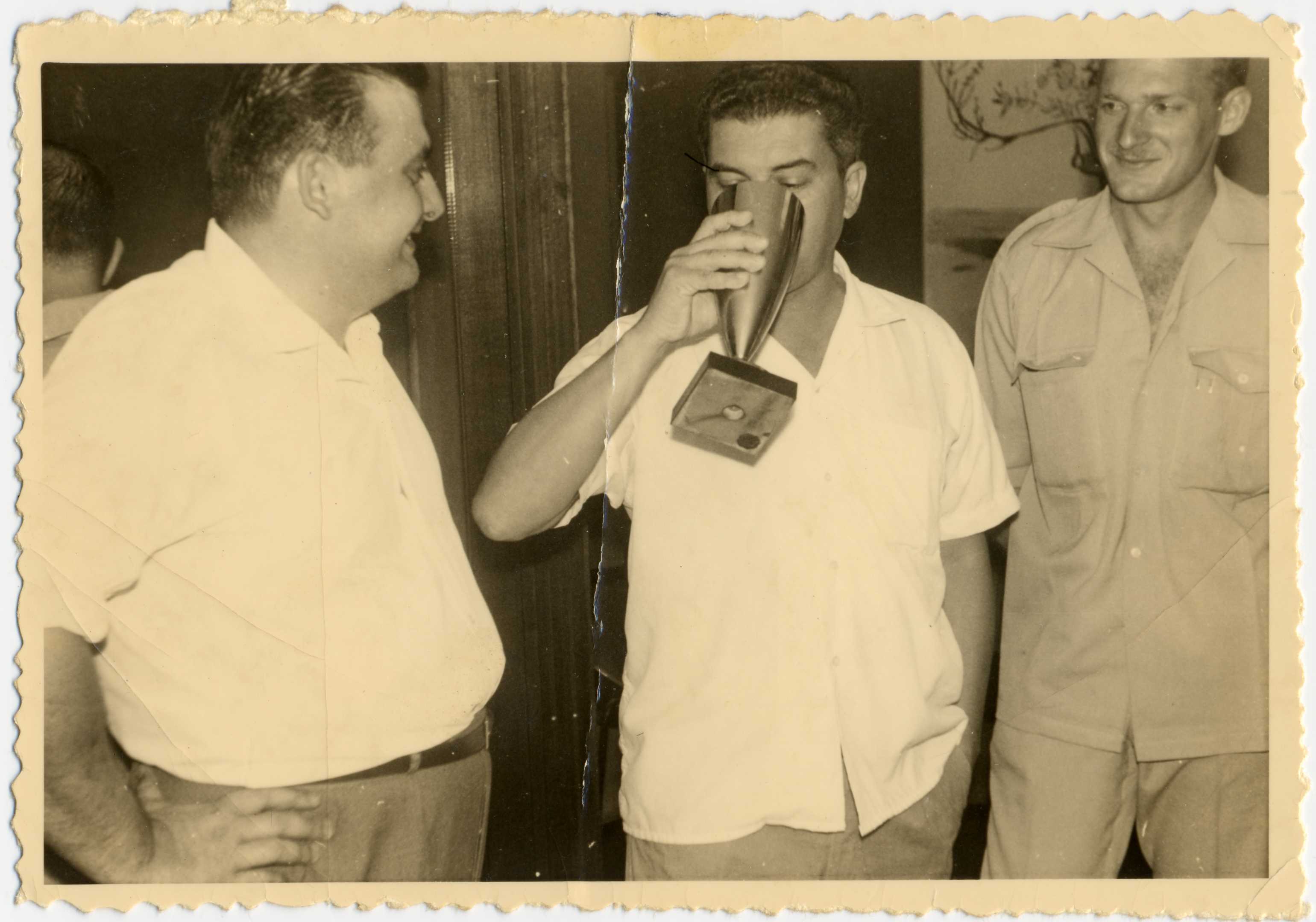 Un homme entouré de 2 autres hommes boit dans un trophée.