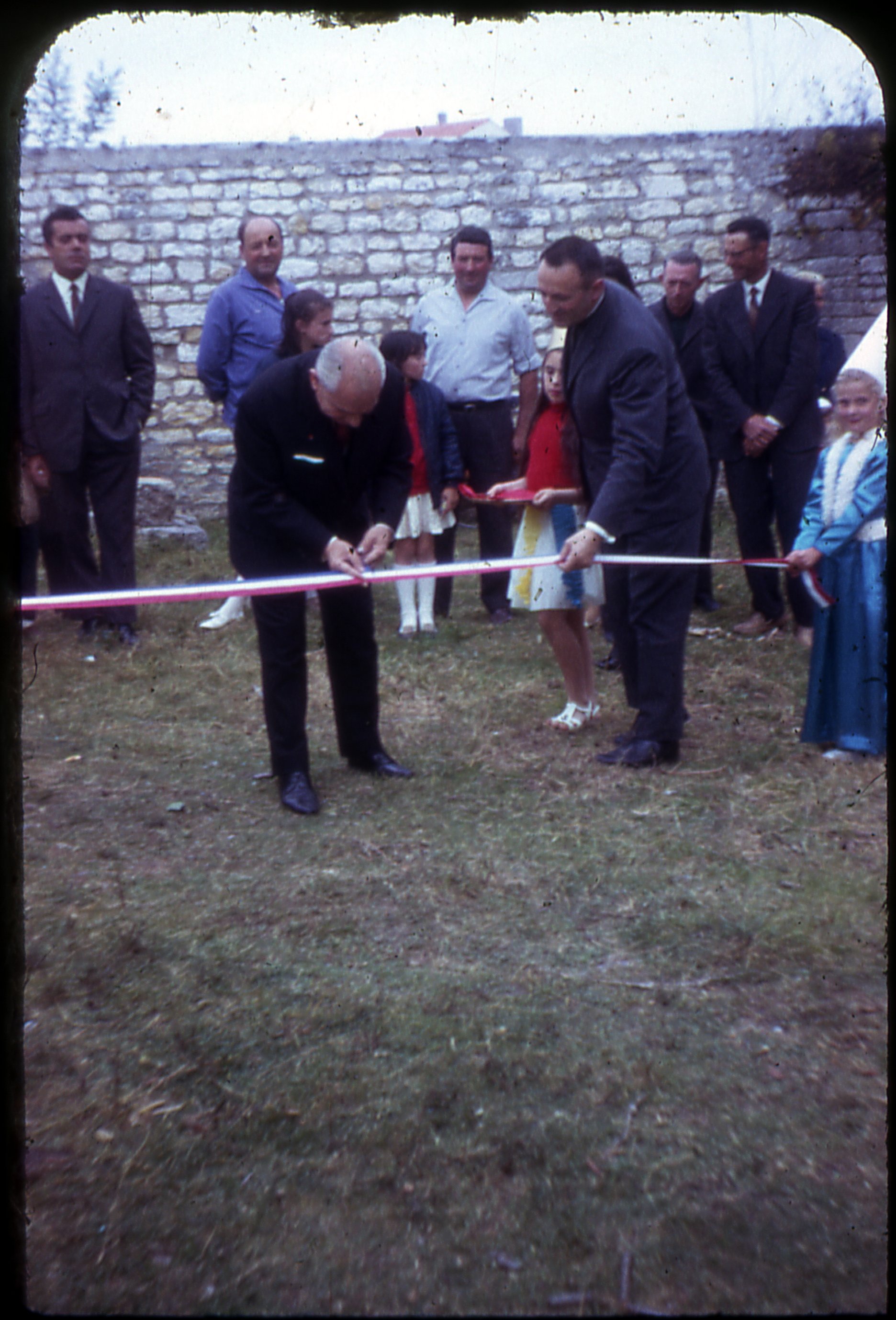 Un homme découpe un ruban tricolore dans une kermesse en 1969